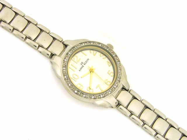 Anne Klein Two Tone with Crystals Watch 10-8867 with the following features: Casual watch, Japanese quartz movement, gold-tone hands and seconds, gold-tone Arabic numbers, silver dial, silver-tone metal bracelet with jewelry-clasp, silver-tone metal bezel with crystals, silver-tone metal round case, gold-tone metal crown, Stainless steel caseback, 29.5mm Case Diameter, 7mm Case Thickness, and watch length is 6-1/4 inches long.