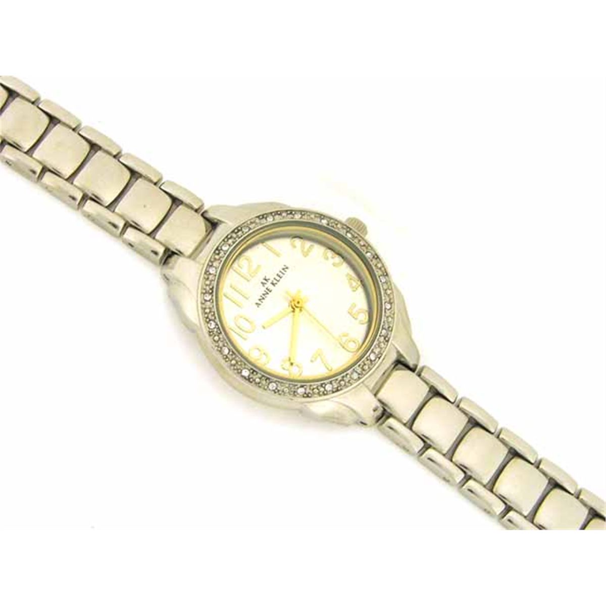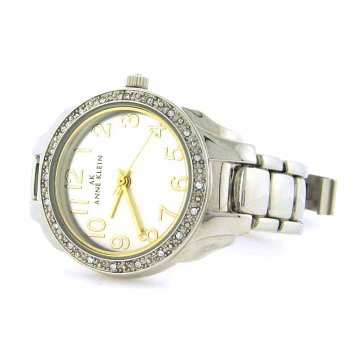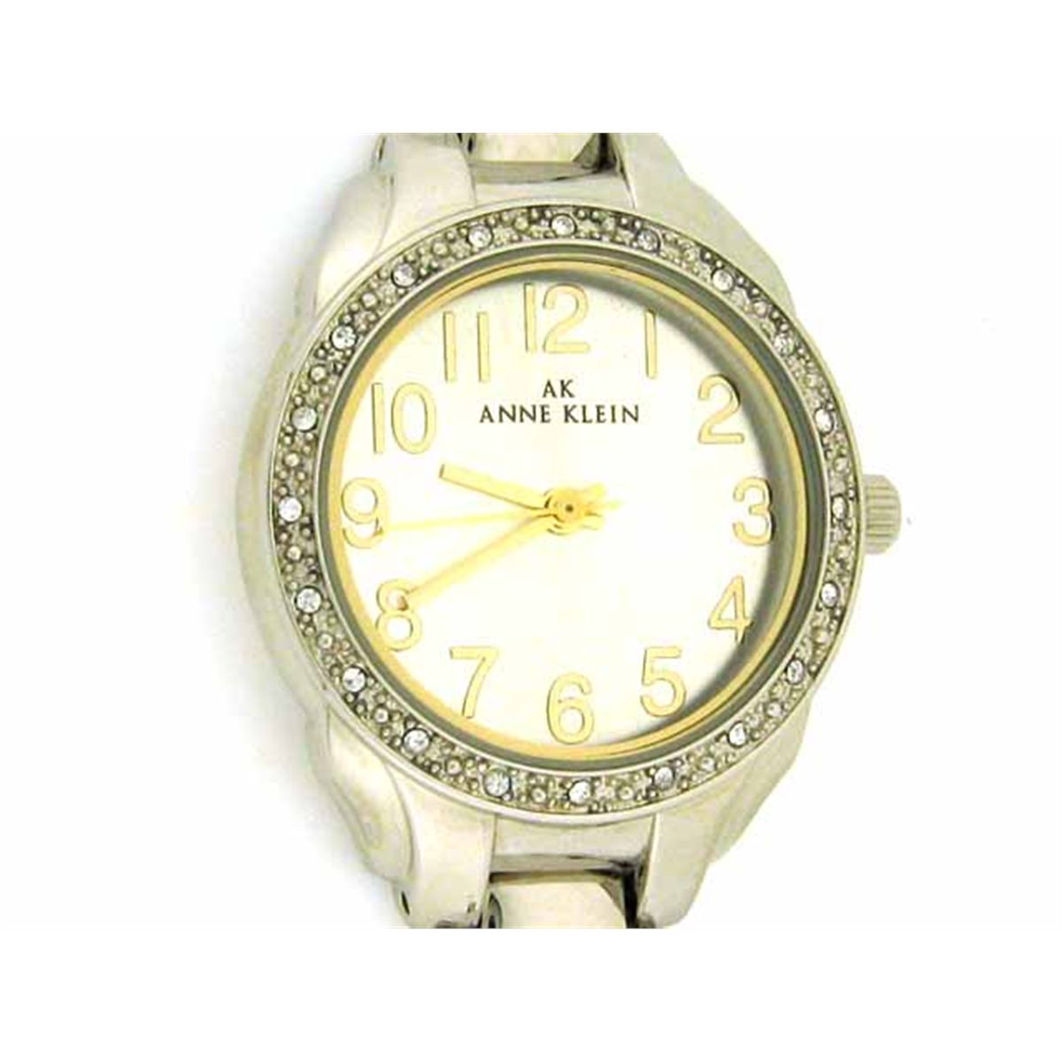 Anne Klein Two Tone with Crystals Watch 10-8867 with the following features: Casual watch, Japanese quartz movement, gold-tone hands and seconds, gold-tone Arabic numbers, silver dial, silver-tone metal bracelet with jewelry-clasp, silver-tone metal beze
