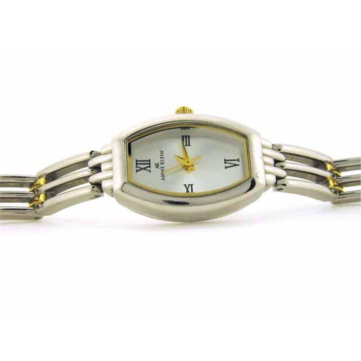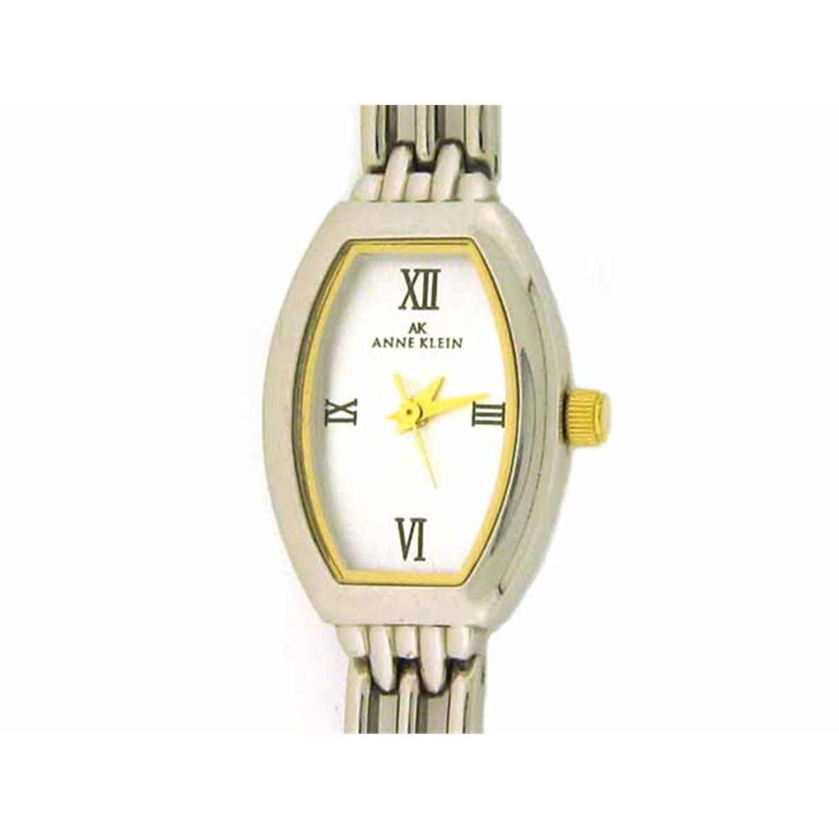 Two tone bezel and bracelet; Gold tone crown, seconds and hands; Base metal bezel; Silver tone dial; Stainless steel back; Japan quartz movement; Length (end to end) - 6.5 inches long