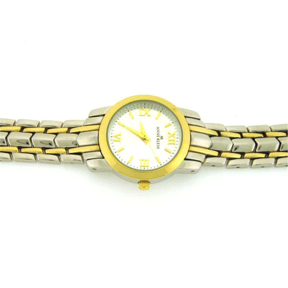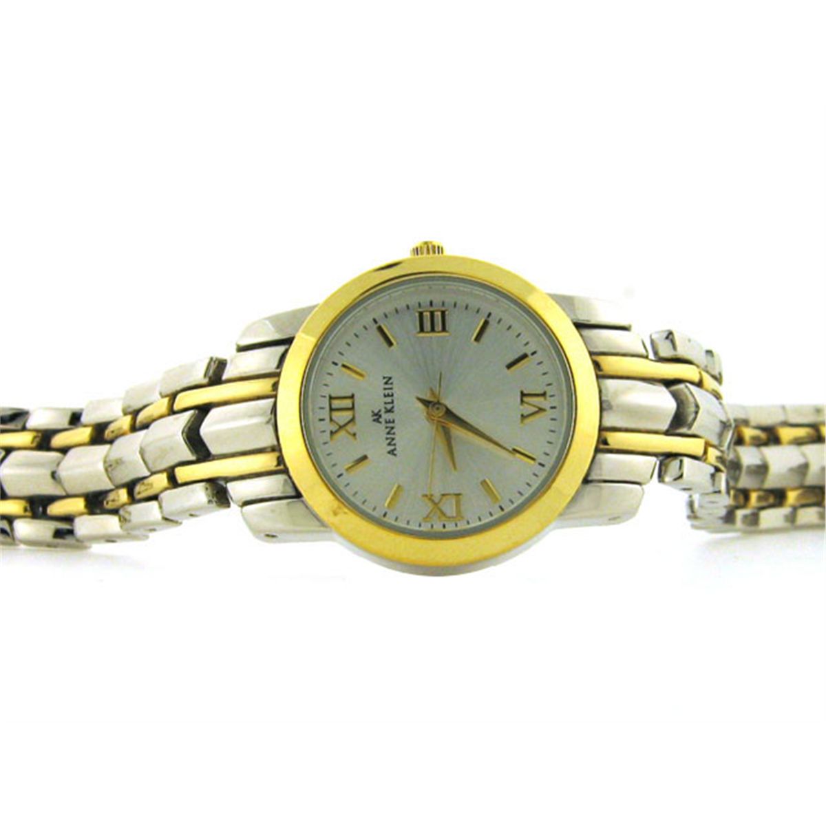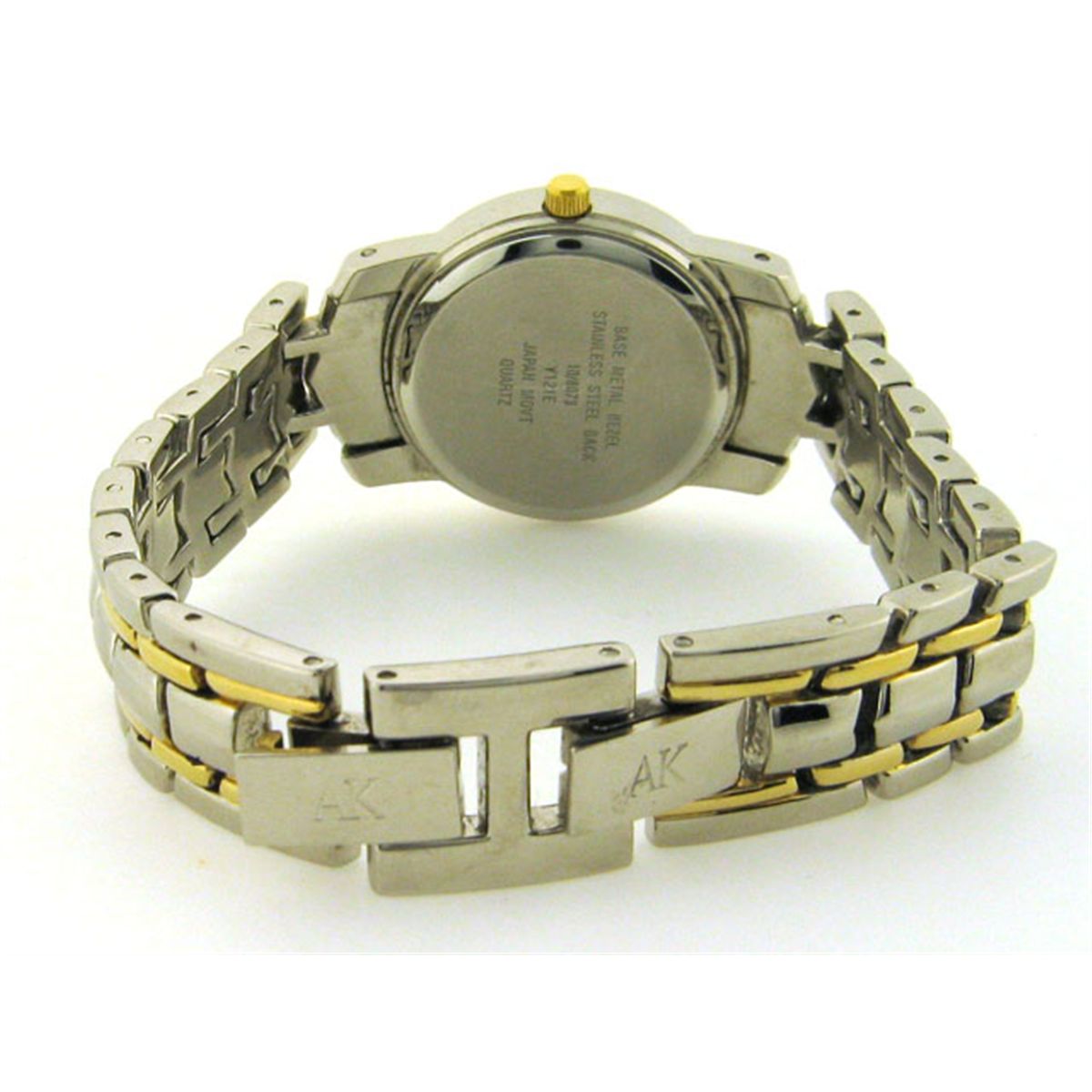 Base metal bezel; Stainless back; Japan quartz movement; Two tone bezel and bracelet; Gold tone crown, markers, seconds, and hands; Silver tone dial; Length - 7 nches with 1/2 inch extension