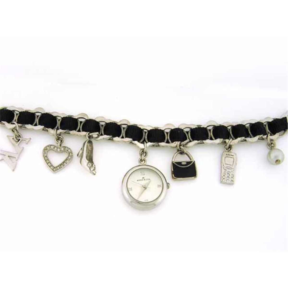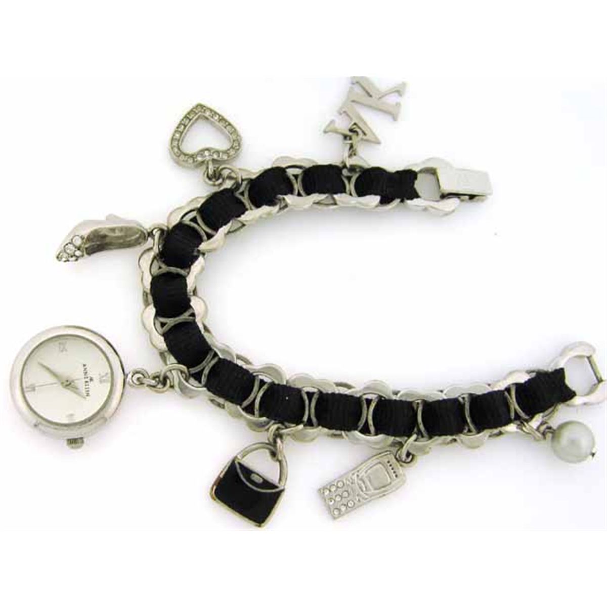 White dial; Silver tone markers, hands and crown; Base metal bezel; Stainless steel back; Quartz movement; Push/pull crown; Length - 6.5 inches long.