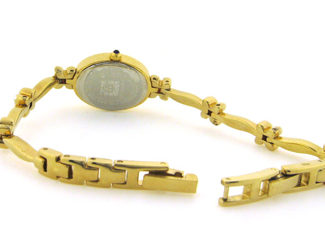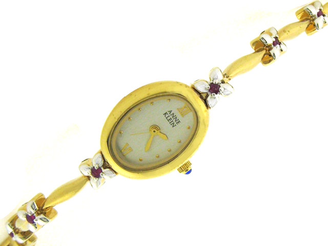 Sapphire crown; Rubies accent; Two tone bracelet; Silver tone dial; Gold tone markers, hands, seconds sweep; Quartz movement; Base metal bezel; Stainless steel caseback; and Watch length is 7.25 inches long