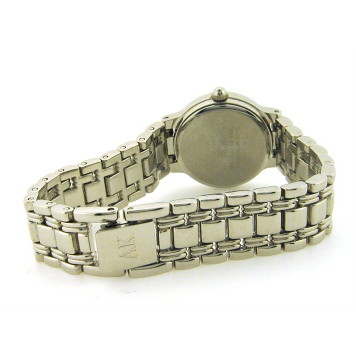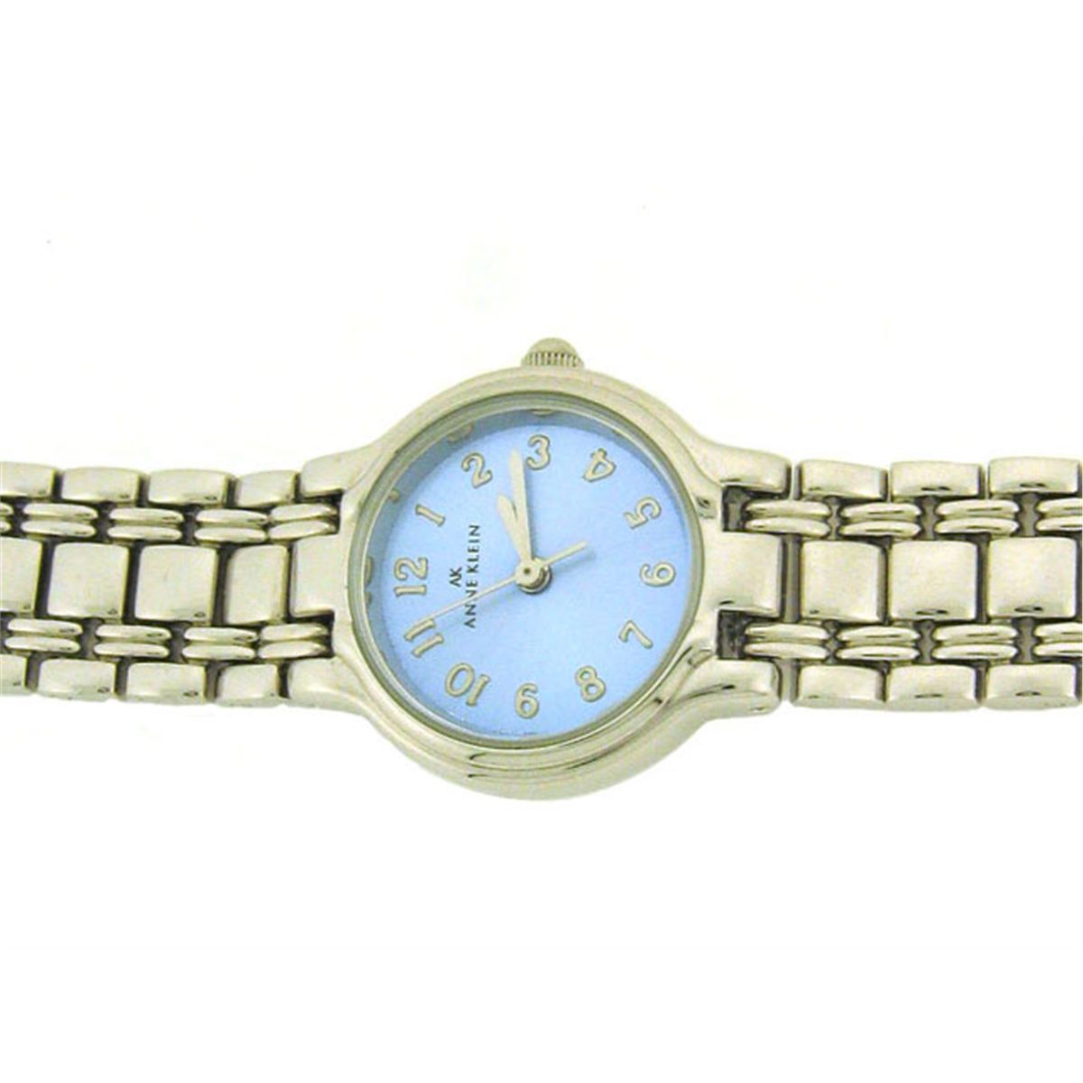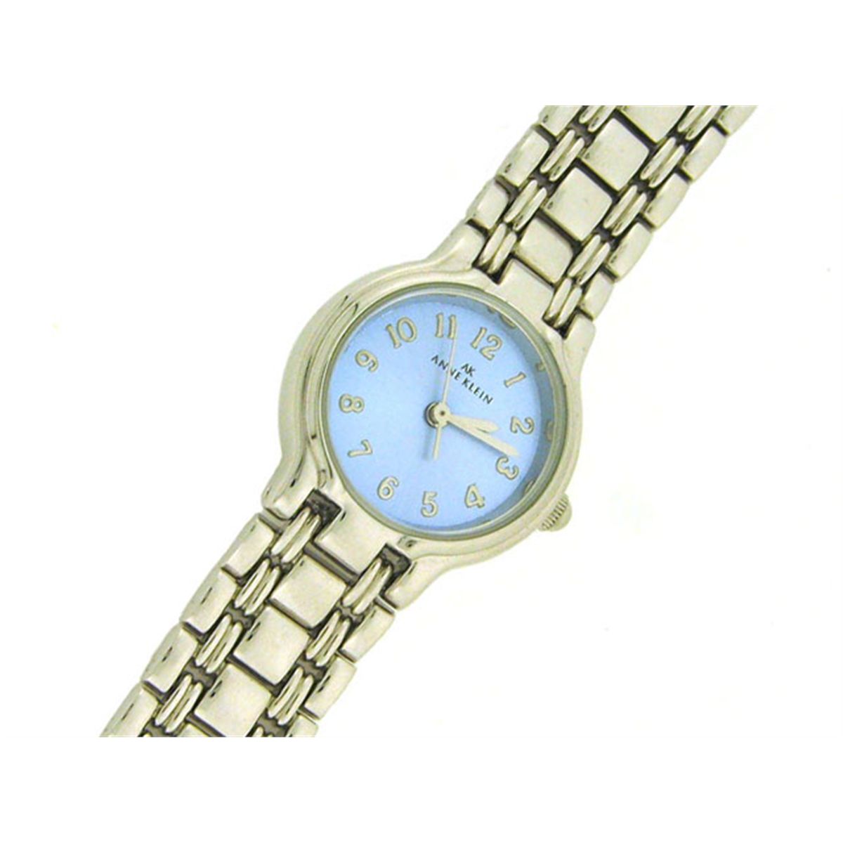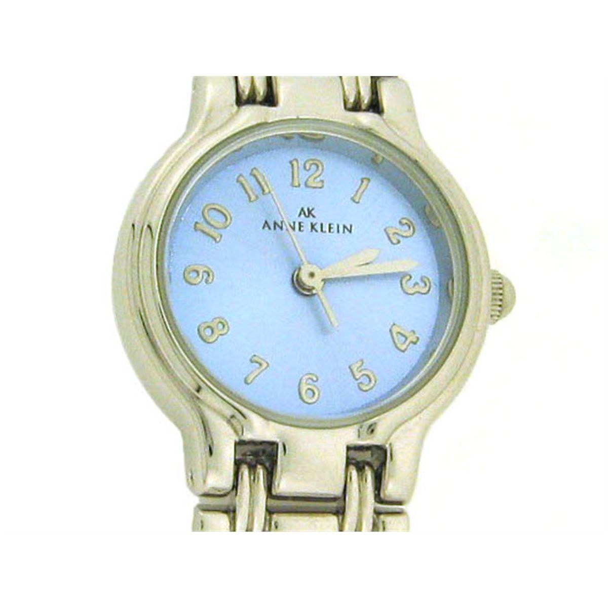 Blue dial; Silver tone markers, hands, second; Japan quartz movement; Base metal bezel; and Stainless steel back