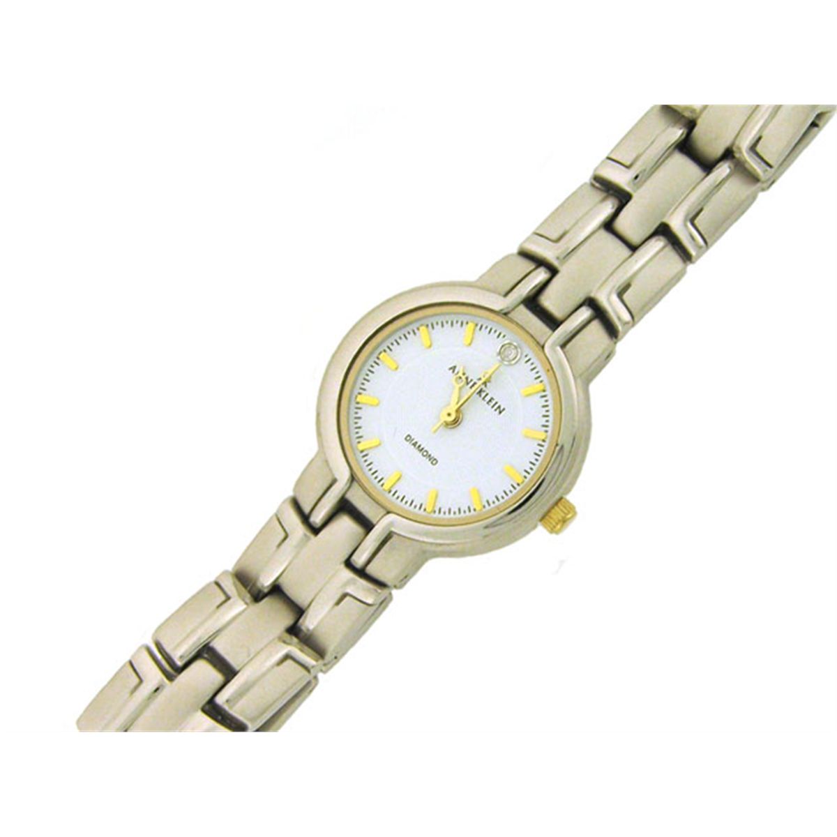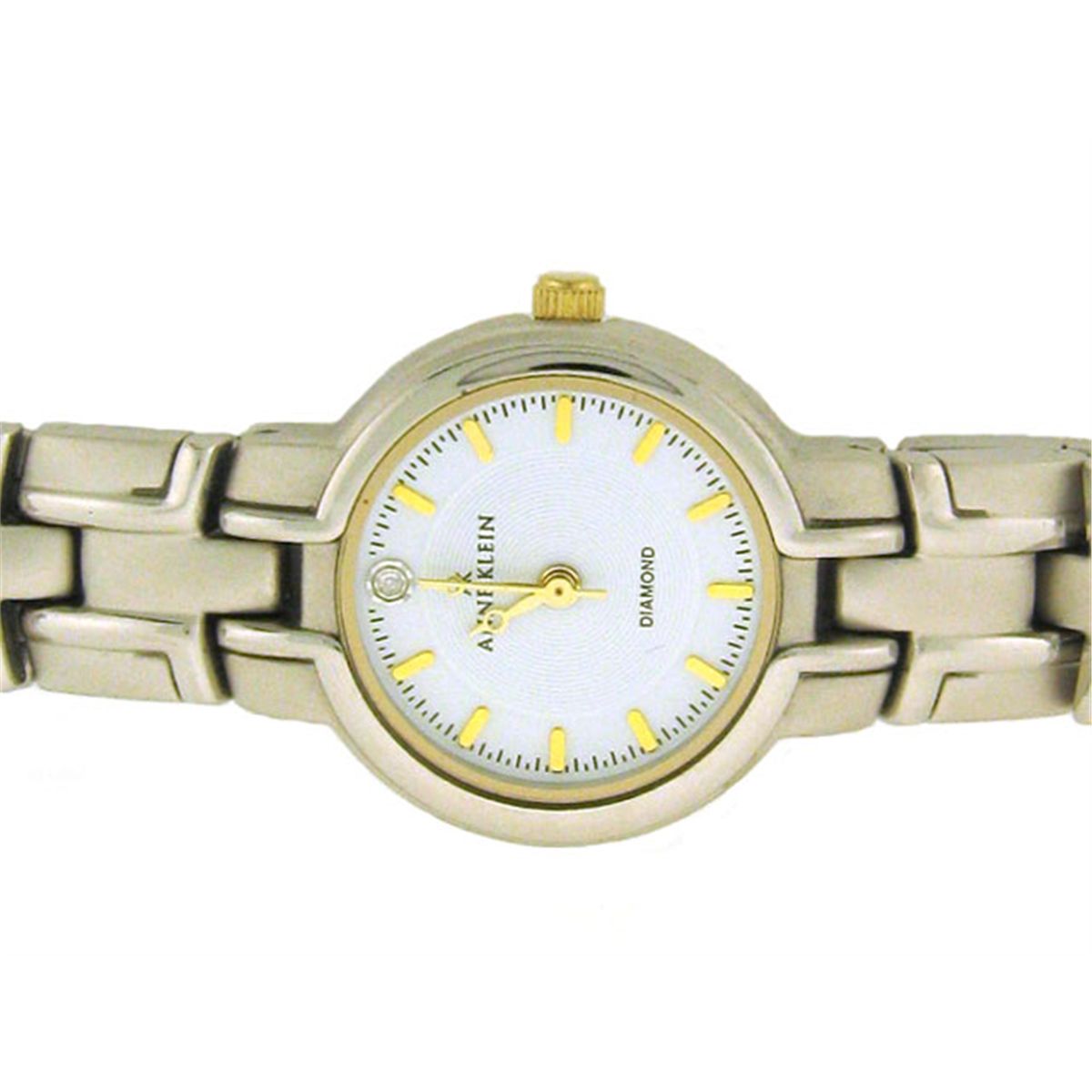 Two-tone case; Stainless steel case back; Stainless steel round bezel; White dial; Black printed minute track; Goldtone stick markers; Stainless steel bracelet with jewelry clasp; Goldtone hour and minute hands; Push/ pull out crown; Mineral crystal; Japanese movement; Water resistant to 30 meters; Case measures 22.7 mm wide; and Bracelet measures 11.8 mm wide x 7.5 inches long.