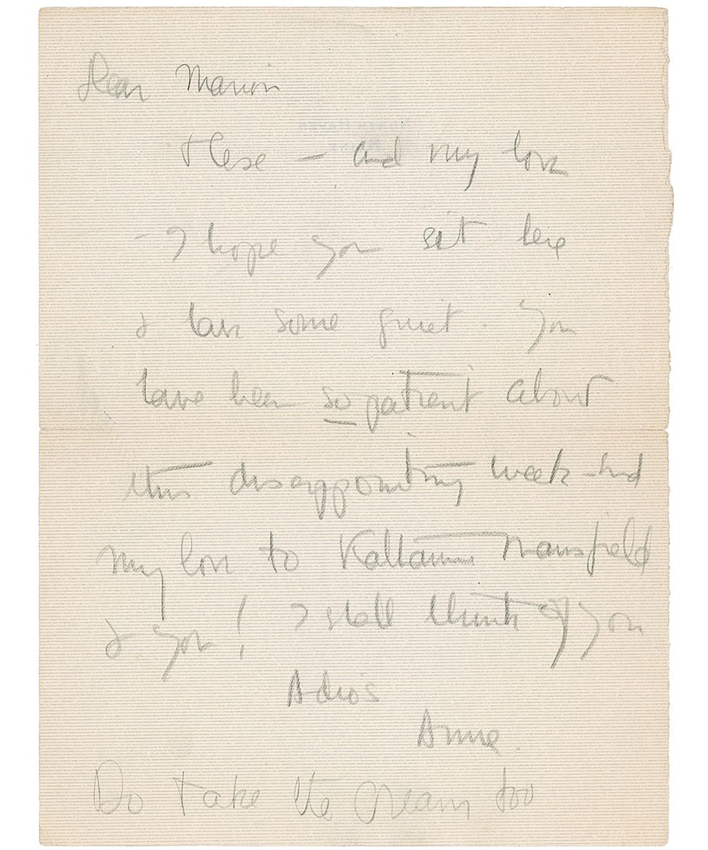 ALS in pencil, signed “Anne,” one page, 6 x 8, North Haven letterhead, no date but postmarked July 7, 1933. Letter to her college roommate Marion Reagan. In part: “These—and my love—I hope you get here & have some quiet. You have been so patient about this disappointing weekend,” and a postscript stating “Do take the cream too.” Partial separations along horizontal mailing fold, and some scattered light creasing and toning, otherwise fine condition. Accompanied by the original mailing envelope. The importance of this letter is that it was written two days before Charles and Anne left for the Atlantic Survey, a trip which lasted until December 19, 1933. Interesting to note how calm and collected Anne was with this dangerous trip on the horizon, even taking the time to write her best friend the letter offered here.