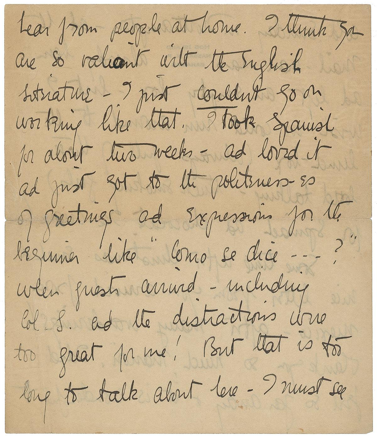 Amazing ALS signed “Anne,” three pages both sides, 6 x 7, Hog Island letterhead, postmarked January 21, 1929. Letter to her old college friend Marion Reagan. In part: “Your Christmas card made me feel like a terrible sinner, although no letter or telegram had reached me! That is the trouble living in such an edge of the world place as Mexico and in such an express-car fashion: In Mexico for a month—in New York for a week or so—to Nassau for ten days to give Daddy [Dwight Morrow, then United States Ambassador to Mexico] a rest…I think you are so valiant with the English literature, I just couldn’t go on working like that. Took Spanish for about two weeks—and loved it and just got to the politenesses of greetings…when guests arrived—including Col. L. and the distractions were just too great for me.” Light toning to all pages, and light show-through from writing on opposing sides, otherwise fine condition. Accompanied by the original mailing envelope.
