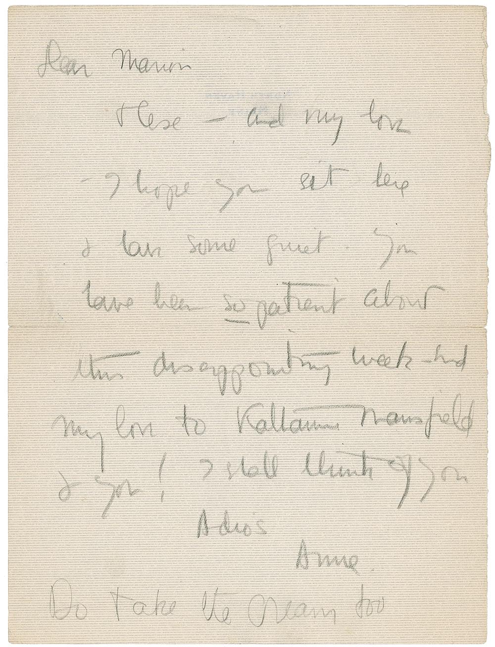 ALS in pencil, signed “Anne,” one page, 6 x 8, North Haven letterhead, no date but postmarked July 7, 1933. Letter to her college roommate Marion Reagan. In part: “These—and my love—I hope you get here & have some quiet. You have been so patient about this disappointing weekend,” and a postscript stating “Do take the cream too.” Partial separations along horizontal mailing fold, and some scattered light creasing and toning, otherwise fine condition. Accompanied by the original mailing envelope. The importance of this letter is that it was written two days before Charles and Anne left for the Atlantic Survey, a trip which lasted until December 19, 1933. Interesting to note how calm and collected Anne was with this dangerous trip on the horizon, even taking the time to write her best friend the letter offered here.