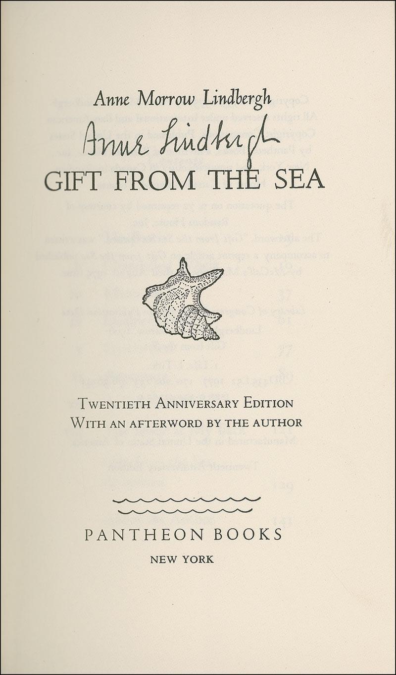 Signed book: Gift from the Sea. Twentieth anniversary edition. NY: Pantheon Books, 1975. Hardcover, 5.25 x 8.25, 142 pages. Signed on the title page in black ink. In fine condition, with some light corner bumps to covers, as well as some scattered light soiling and damp staining