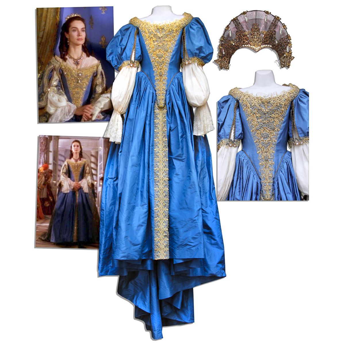 Anne Parillaud's gown from ''Man in the Iron Mask''. Parillaud stars as the Queen Mother, Anne of Austria in the 1998 drama, opposite Leonardo DiCaprio. Blue silk gown worn by Parillaud in the masquerade ball scene is made by costumer Jane Law of London. Features a gold lace design overlaid upon the fitted bodice and in a strip running down the front of the skirt. Long sleeves of off-white silk are adorned with lace cuffs under billowy blue silk short sleeves. Floor-length dress features an elegant train. An archive tag with a typed label reads ''#0103418''. Accompanied by a tiara with faux teardrop pearls and openwork metal pieces before a fine purple mesh. Gown measures 23'' around the waist. Staining to hem at left and light soiling above the hem at the front, else near fine. Tiara measures 10.5'' x 8'' x 4''. Small losses to tiara, else near fine.