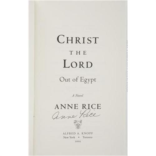 <B>Anne Rice. </B></I><B><I>Christ the Lord Out of Egypt</B></I></B></I><B>.</B></I> New York: Alfred A. Knopf, 2005. <BR>First edition. Signed by the author on the title page. Octavo. 322 pages.<BR><BR>Publisher's original white boards with titles in gilt on the spine. Externally and internally sound. Dust jacket with retailer's stickers still attached. Fine. <I>From the Robert and Diane Yaspan Collection.</B></I><BR><BR><b>Shipping:</b> Books & Catalogs (<a target="_blank" href="http://www.heritageauctions.com/common/shipping.php">view shipping information</a>)
