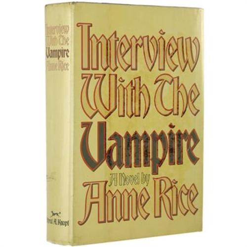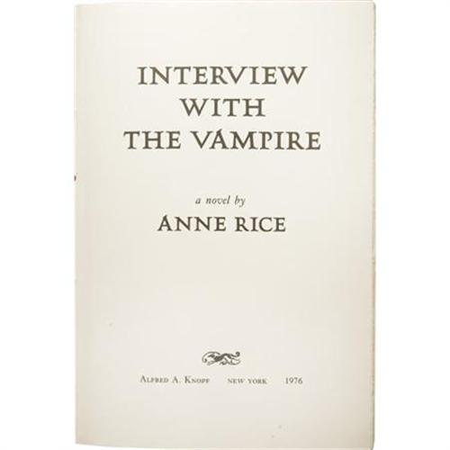 <B>Anne Rice: <I>Interview with the Vampire</B></I></B></I> (New York: Alfred A. Knopf, Inc., 1976), first edition, 372 pages, black paper boards shelf backed in black cloth with gilt titles, 8vo (5.75" x 8.5"), dust jacket. The book is in about very good condition, with spine cocked and minor abrasions to the endpapers where the dust jacket Mylar has stuck to them. The dust jacket itself is also in about very good condition, with minor edge and spine wear and one small gouge on the spine.<BR><BR><b>Shipping:</b> Books & Catalogs (<a target="_blank" href="http://www.heritageauctions.com/common/shipping.php">view shipping information</a>)