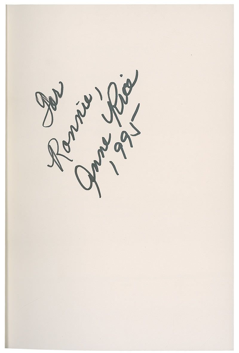 Signed book: Interview with the Vampire. Later printing. NY: Alfred A. Knopf, 1994. Hardcover with dustjacket, 6.5 x 10, 274 pages. Signed and inscribed on the first free end page, “For Ronnie, Anne Rice 1995.” In fine condition.