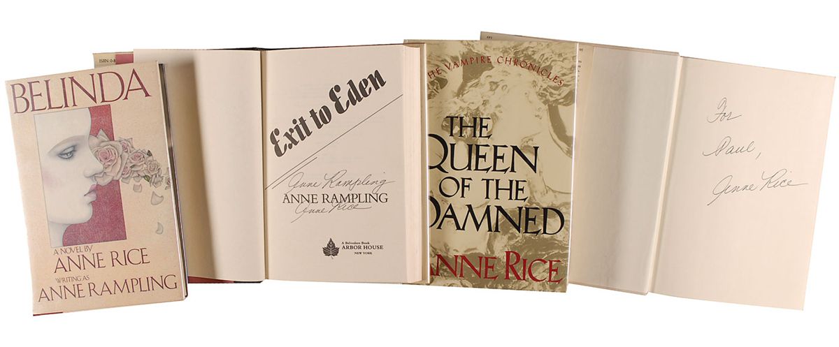 Four hardcover books: The Vampire Lestat and Queen of the Damned, each signed and inscribed on the first free-end page; Exit to Eden, signed on the title page, “Anne Rampling” and “Anne Rice”; and Belinda, signed on the title page, “Anne Rice.” In fine condition.
