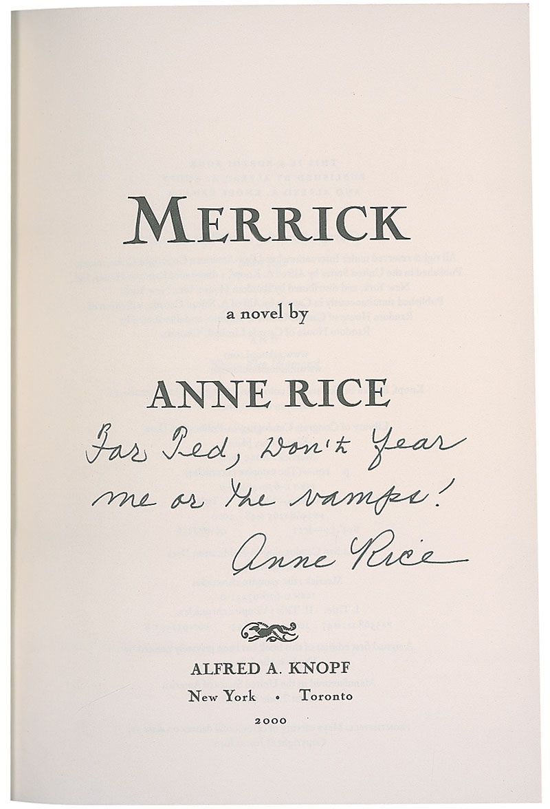 Two hardcover books, Merrick, signed and inscribed on the title page, “For Ted, don’t fear me or the vamps! Anne Rice”; and Servant of the Bones, signed and inscribed on the first free end page. In fine condition.