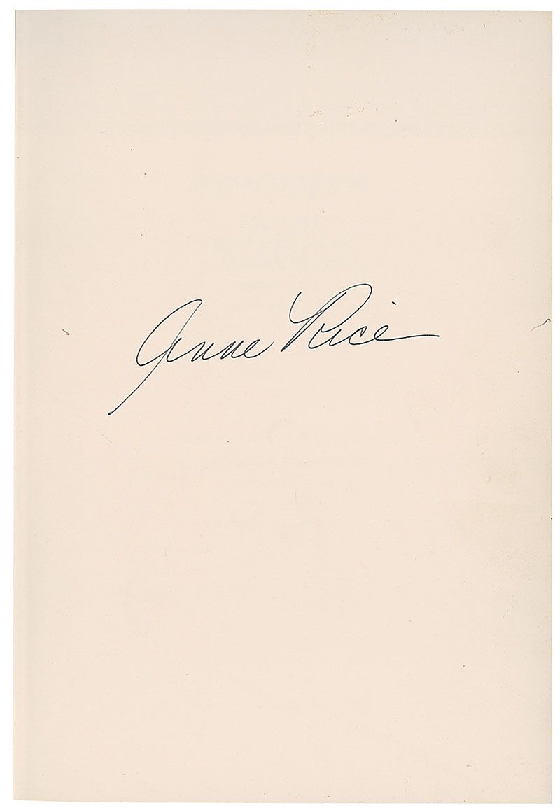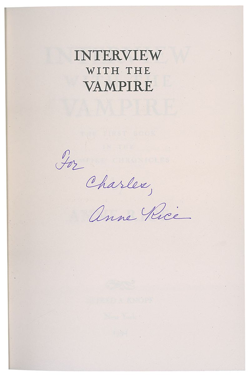 Two hardcover books: Interview with the Vampire, signed and inscribed on the half-title page; and Queen of the Damned, signed on the first free end page. In fine condition, with gift inscriptions to front pastedown of Queen of the Damned.
