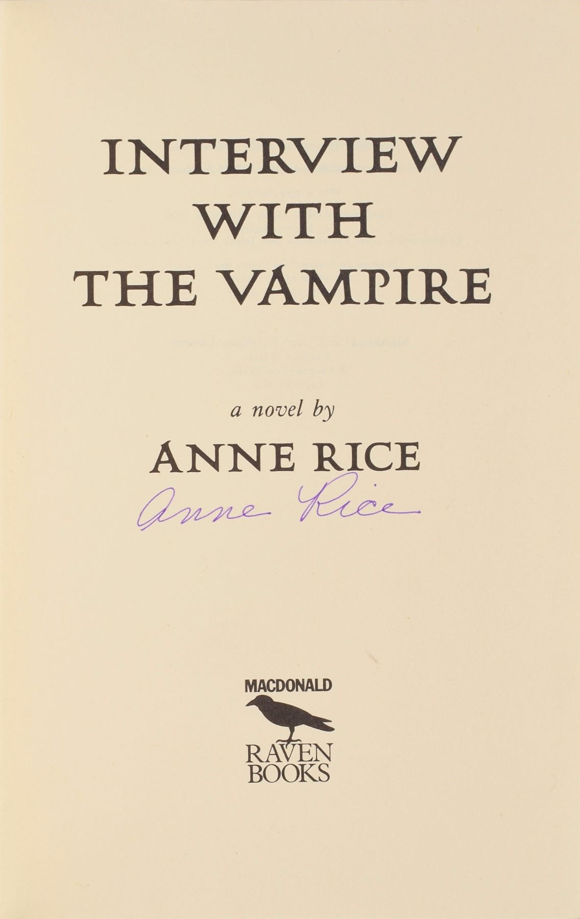 Five signed books: a first UK edition of Interview with the Vampire, hardcover with dust jacket, signed on the title page in purple ink; a limited deluxe first edition of Pandora, hardcover with slipcase, numbered 41/50, signed on the colophon in blue ink; a first edition of Christ the Lord: Out of Egypt, hardcover with dust jacket, signed on the half-title page in black ink; a first trade edition of Merrick, hardcover with dust jacket, signed on the half-title page in black ink; and a first trade edition of The Vampire Armand, hardcover with dust jacket, signed on the half-title page in purple ink. Also includes two 3.5 x 4 bookplates signed in black felt tip by Rice, and a copy of Light Before Day signed and inscribed by Christopher Rice, and a limited edition of The Vampire Stories signed by Chelsea Quinn Yarbro. In overall fine condition.
