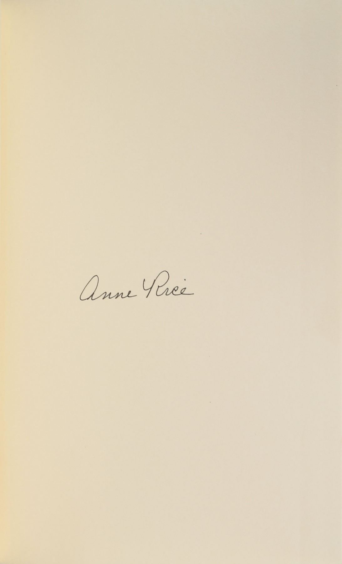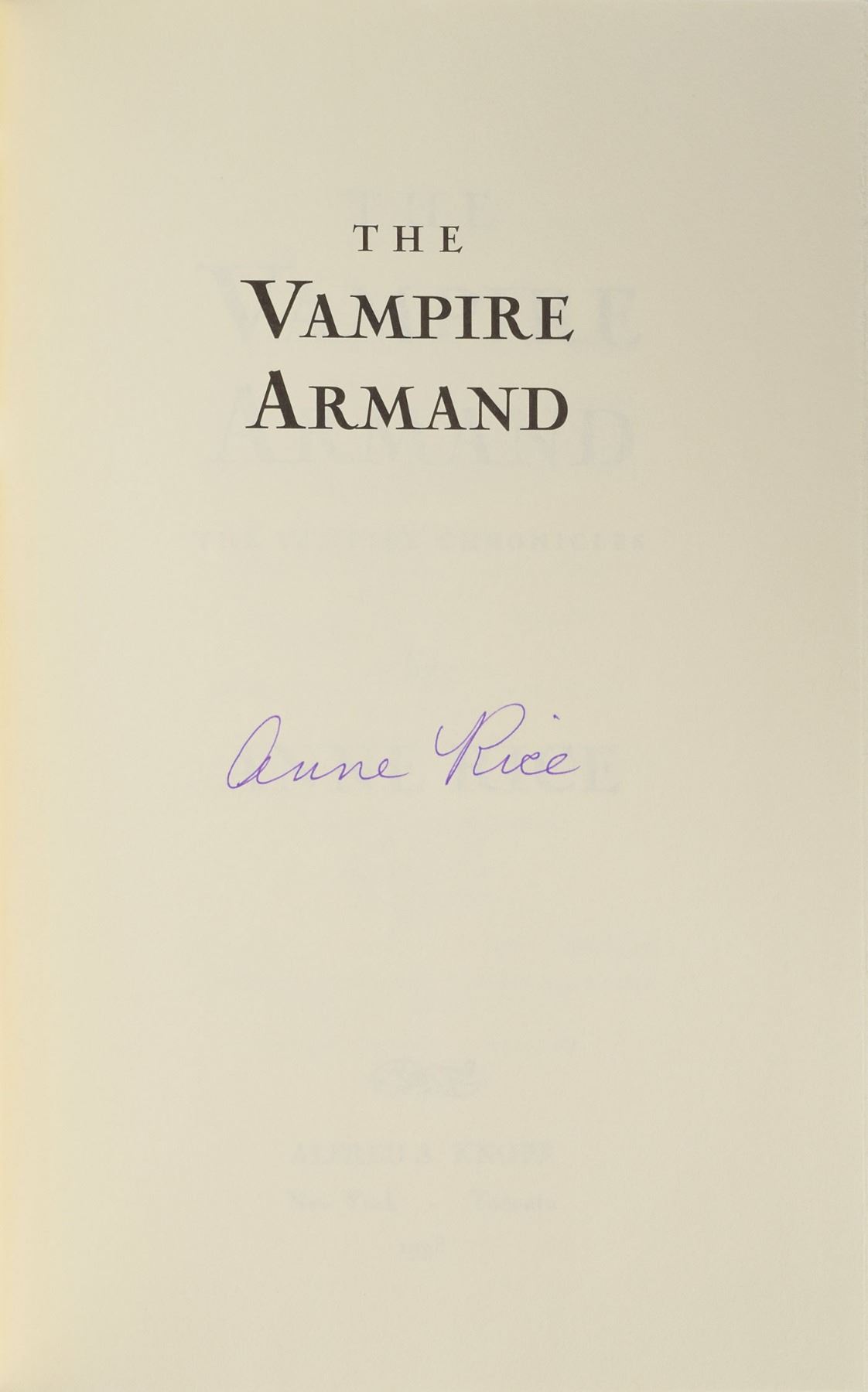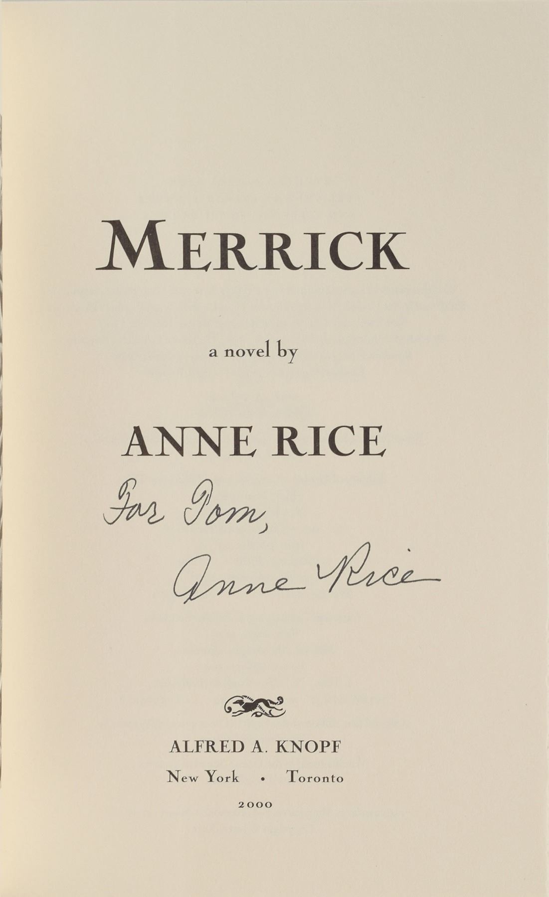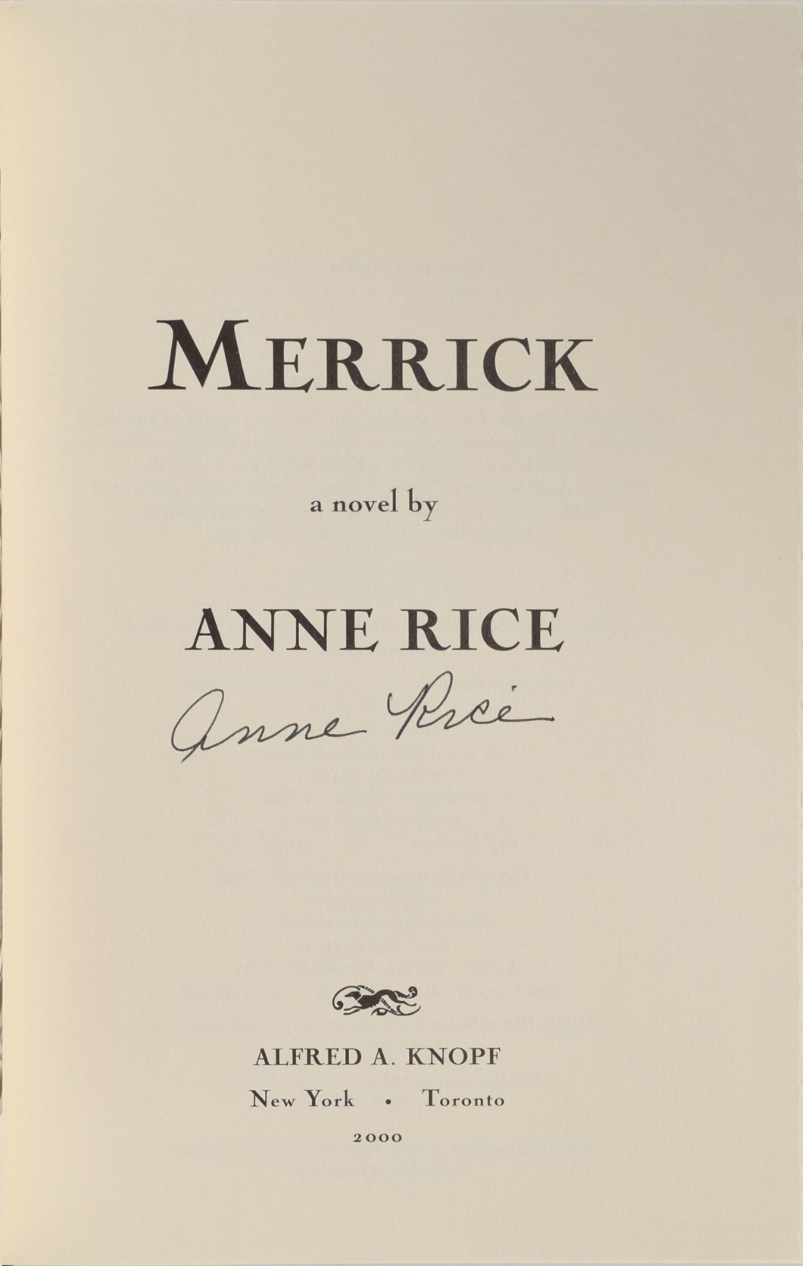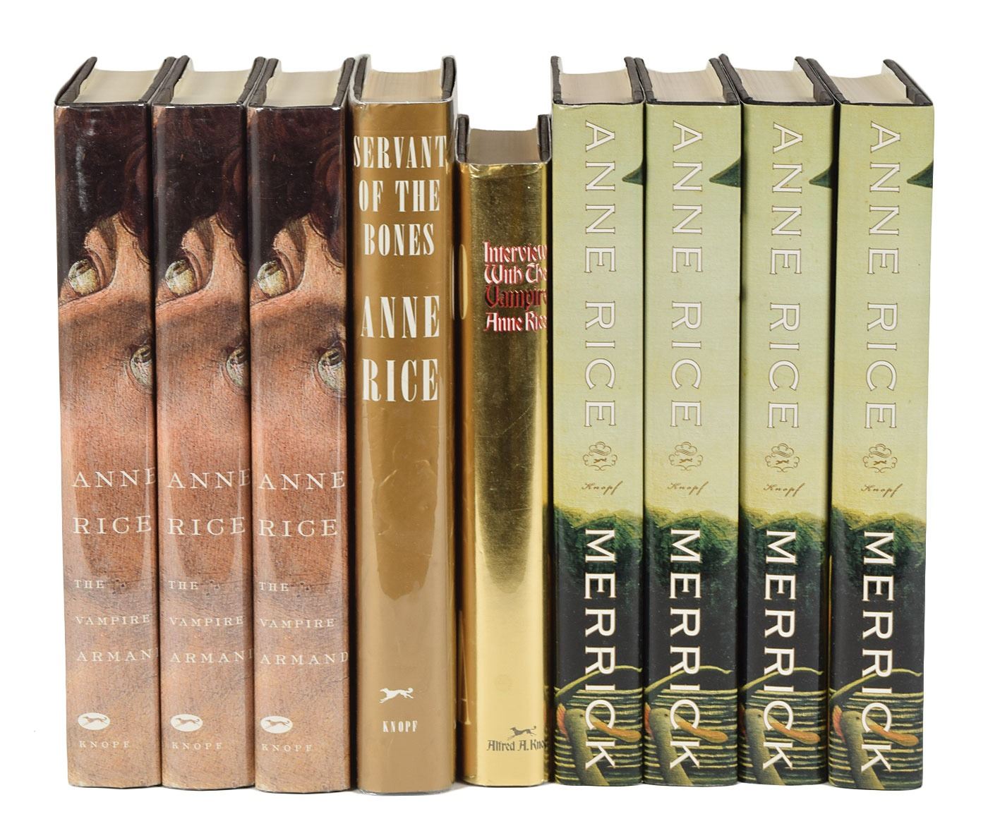 Nine books by Anne Rice, each hardcover with dust jacket, signed on an opening page in ink or felt tip, with titles including: a 1996 anniversary edition of Interview with the Vampire; four first editions of Merrick (one inscribed); a first edition of Servant of the Bones; and three first trade editions of The Vampire Armand. In overall fine condition.