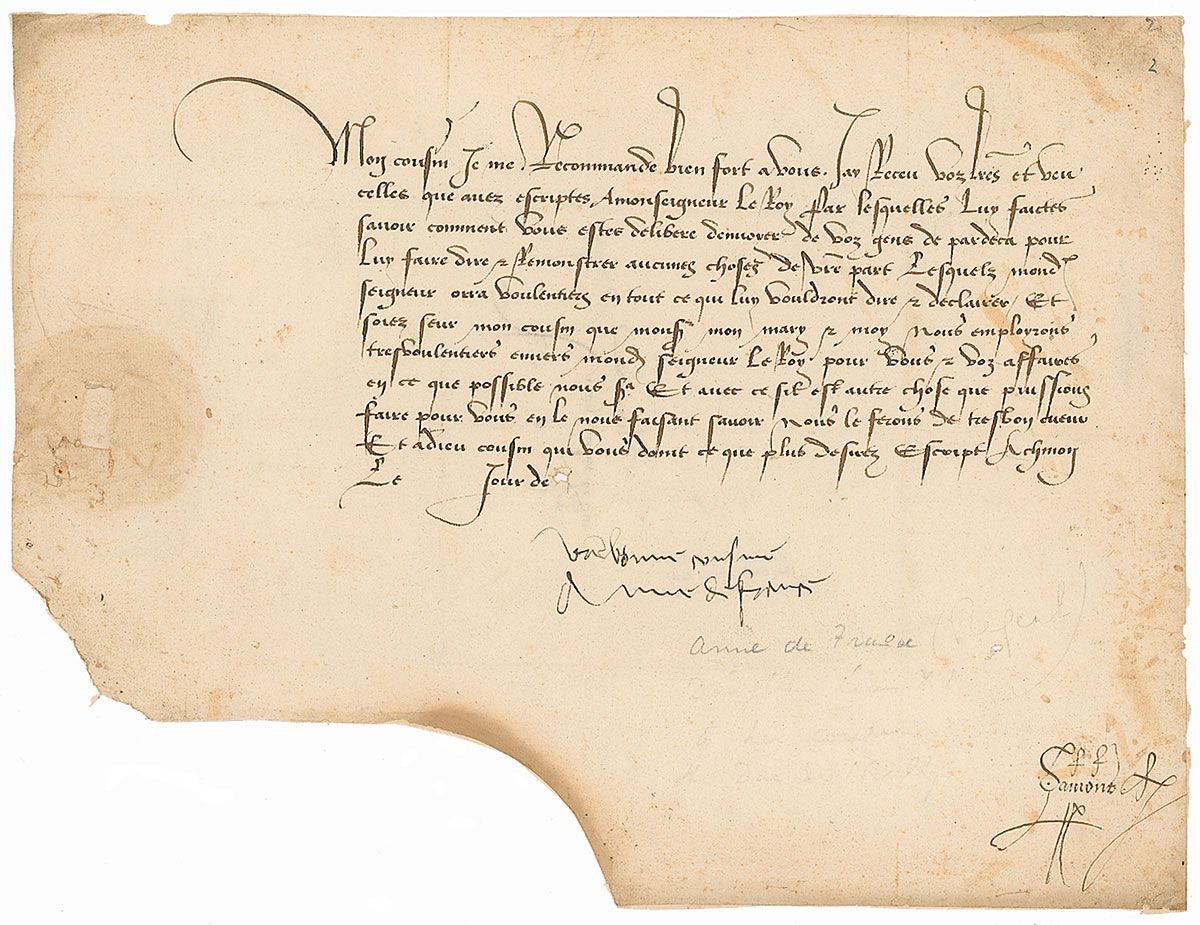 Eldest daughter (1461–1522) of Louis XI of France and his second wife, Charlotte of Savoy. She held the regency of France from 1483 until 1491, making her one of the most powerful women in the late 15th century. Untranslated manuscript LS in French to the Duke of Milan, signed “Anne de France,” one page, 11.25 x 8.5, no date. Seal once affixed to the left side is absent. In very good condition, with intersecting storage folds (not affecting the signature), scattered foxing (heavier to right border), and an area of the lower left trimmed off.