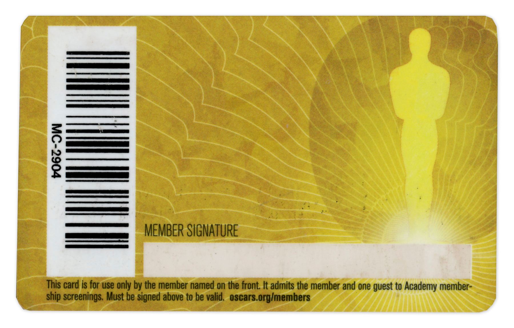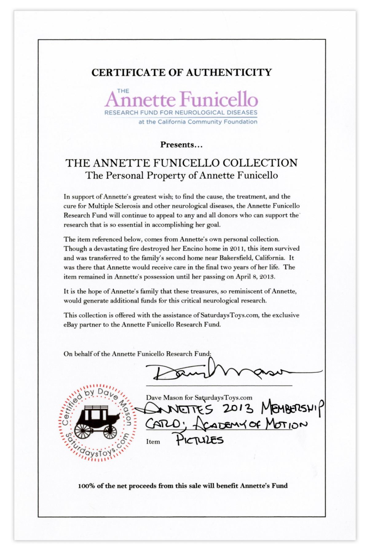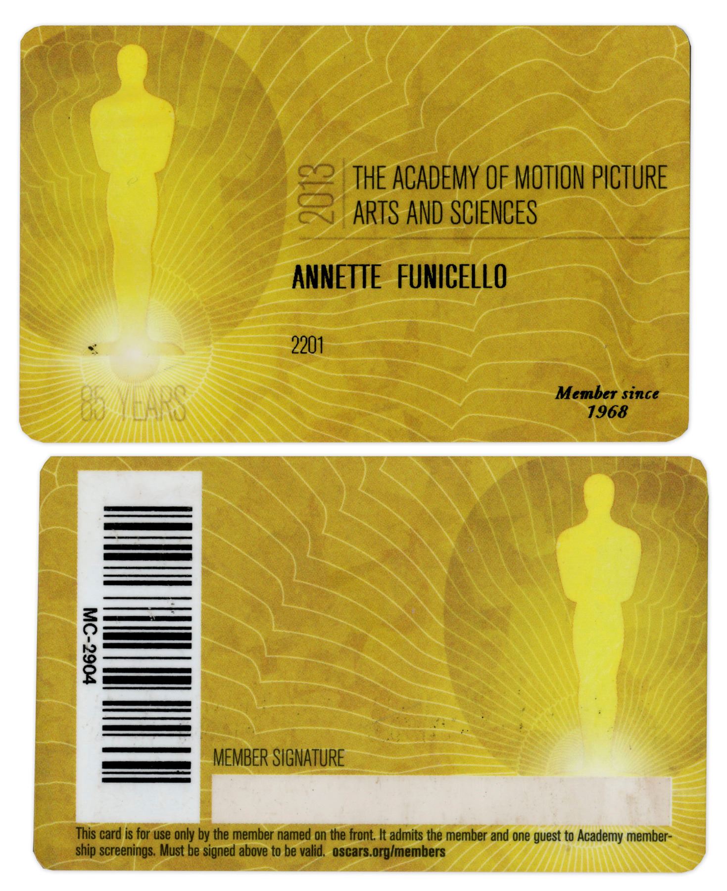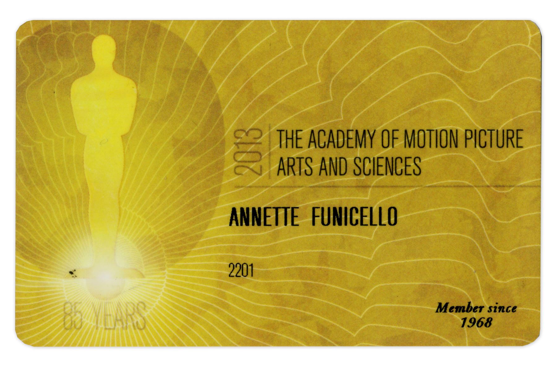Annette Funicello's personal 2013 Academy Award membership card. Famous for her role as one of the original Mouseketeers in ''The Mickey Mouse Club'', Funicello would later be an important film star for her work in movies of the Beach Party genre. Card measures 3.5'' x 2''. Light wear, otherwise near fine. With a COA from Funicello's Research Fund for Neurological Diseases.