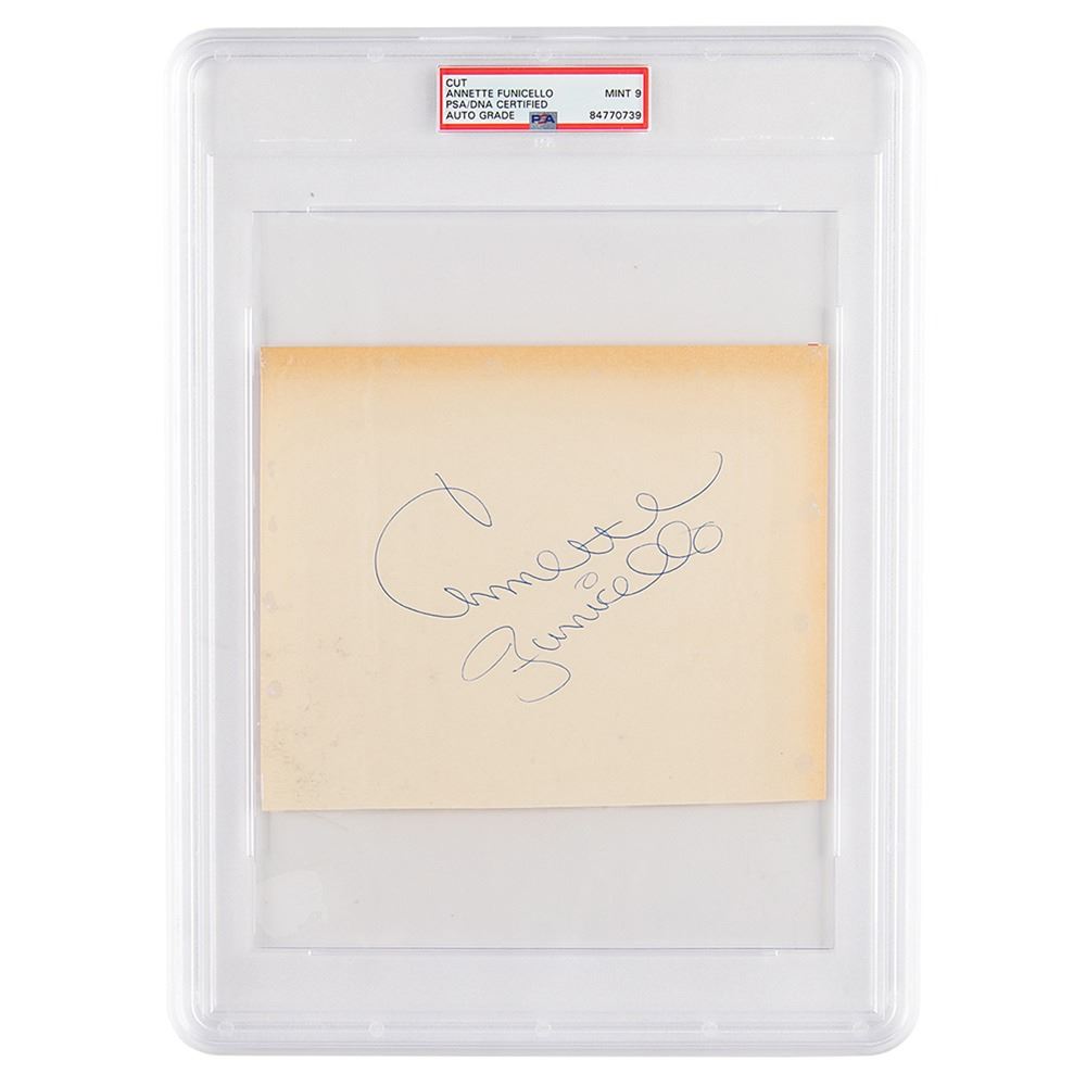 Vintage ballpoint signature, "Annette Funicello,& rdquo; on an off-white 7.25 x 6 sheet. In fine condition, with faint edge toning. Encapsulated and graded by PSA/DNA as "MINT 9."