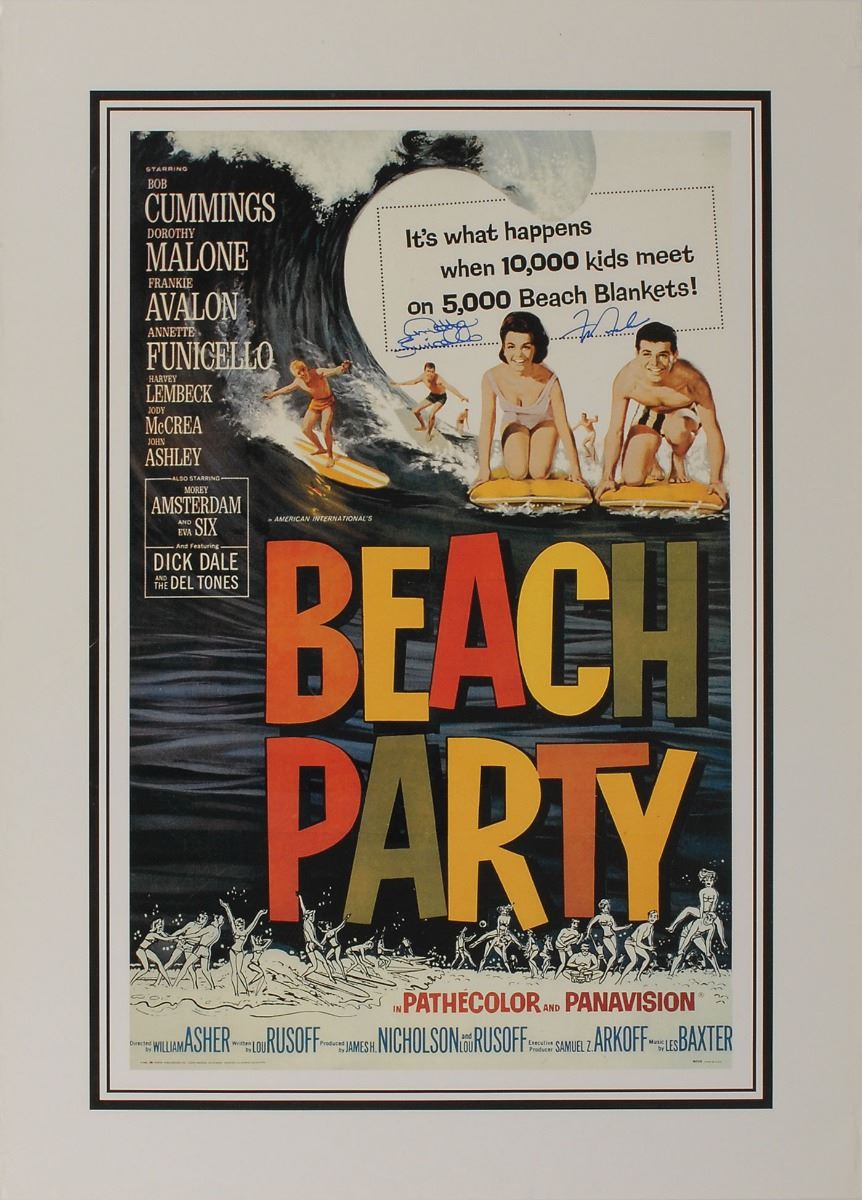 Color 21.25 x 29.5 reproduction movie poster for Beach Party, signed in blue felt tip by Annette Funicello and Frankie Avalon. Rolled and in fine condition, with scattered creasing and edgewear.
