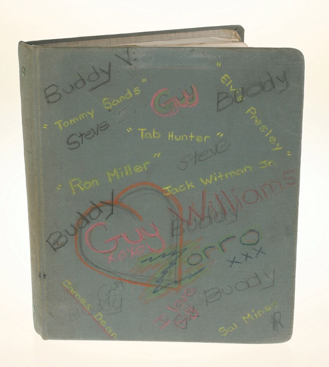(Disney Studio, 1957) Annette Funicello's school notebook containing her school work from October-December of 1957. California state law required that all juvenile performers attend school three hours a day. In the case of the Mouseketeers, the cast attended school in a custom-built trailer on the studio lot. This notebook contains approximately 125 pages of hand-written school work, many of which are hand-signed. The 11.5"x10" three-ring binder was hand-decorated by Funicello with the names of her favorite male stars including: Elvis Presley, Tab Hunter, James Dean, Sal Mineo, Ron Miller, and Guy Williams, whose "Zorro" TV series debuted in October of that year. An incredible archive from a fan-favorite Mouseketeer. In very good condition overall.