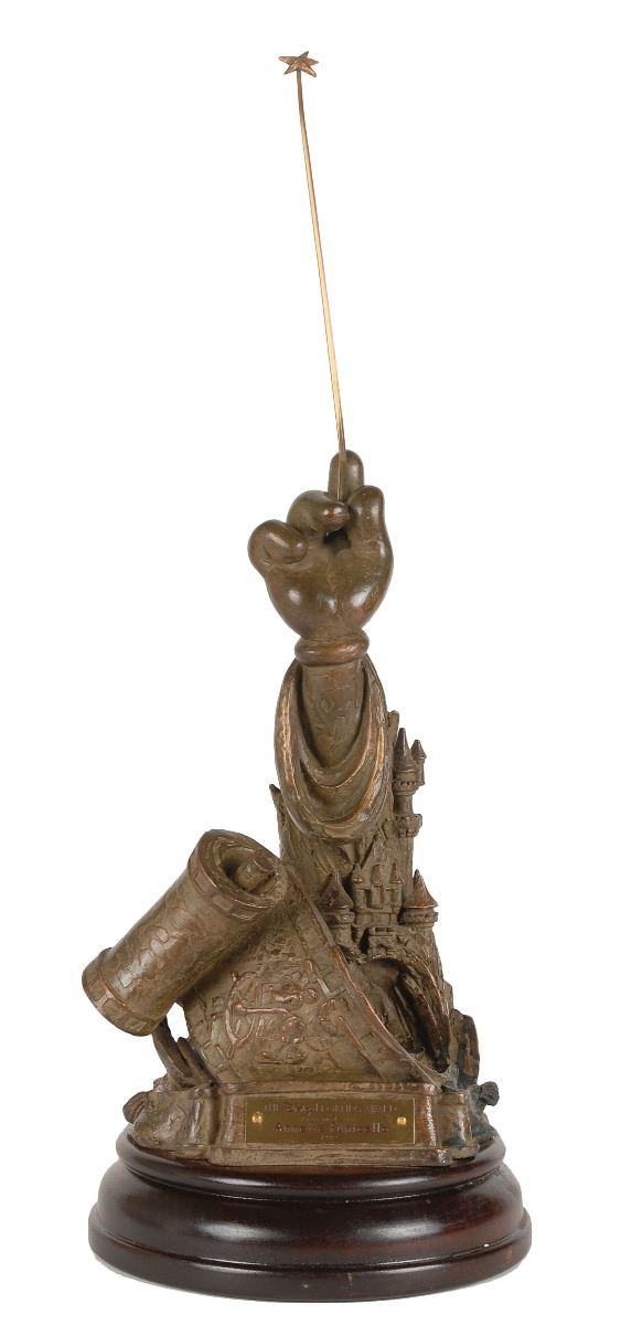 Rare bronze Disney Legends Award given to Annette Funicello to honor her contributions to the Walt Disney Company, measuring 22? tall and set on an 8.5? diameter wooden base, weighing 14.2 pounds, with an engraved plaque on the front, “The Disney Legends Award, Presented to Annette Funicello, 1992.” The gorgeous award statuette portrays Mickey’s arm rising up from a swirl of creativity to hold up a star-tipped magic wand. Funicello was honored as a ‘Disney Legend’ on October 21, 1992, one day prior to her 50th birthday. Her original trophy was lost in a fire at her home and replaced by Disney with this example in 2011.