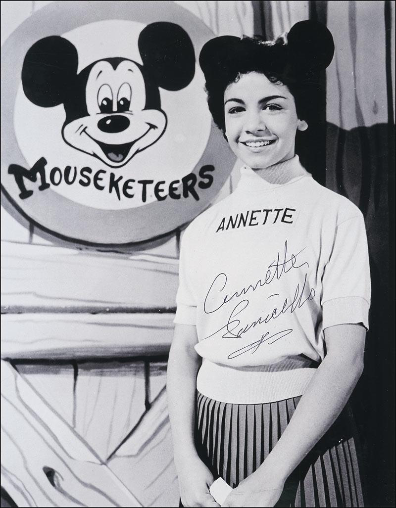 Glossy 11 x 14 photo of Funicello in her Mouseketeer outfit on the Mickey Mouse Club set, signed in black ballpoint. In very fine condition. Pre-certified PSA/DNA and RRAuction COA.