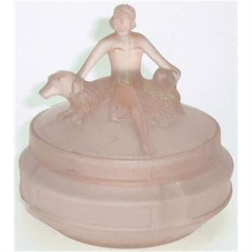 GUARENTEED ORIGINAL - This frosted pink satin glass figural powder jar is known as 'Annette' and shown on pg 33 of Whitmyer's 'Bedroom & Bathroom Glassware of the Depression Years'. With a striking Art Deco design featuring a lady with outstreched arms resting upon her two dogs she is beautifully executed with fine definition and attention to detail. The jar with lid measures about 5in. x 5in. and are both in very good condition.