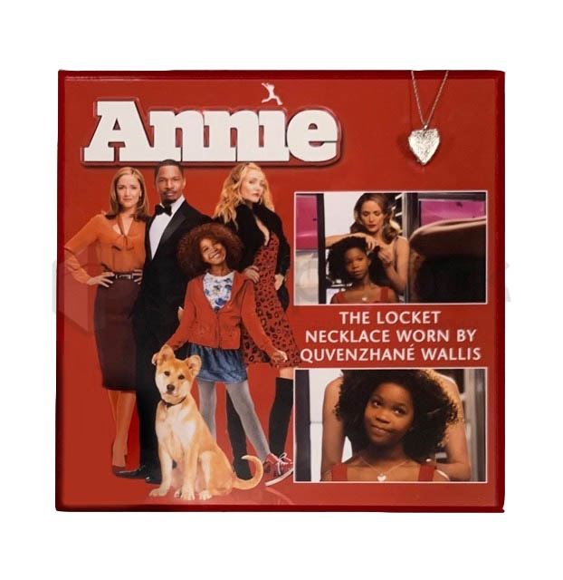 Heart shaped locket featured in the 2014 film Annie. This locket can be seen being worn by the character of Annie, actress Quvenzh Wallis in the film. Made of metal, this locket is shaped like a heart and includes a silver metal chain. This piece has been custom framed and remains in excellent condition.