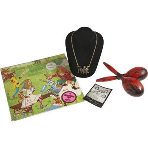 <B>Annie Haslam Owned Maracas, Necklace, and Related Memorabilia.</B></I> Included in this lot is a 22 karat British-made "Annie" necklace given to the singer of the band Renaissance by her fiance at the time, ELO's Roy Wood. Also included is her <I>Annie in Wonderland</B></I> LP, signed and inscribed by the singer over a photo of Haslam wearing the necklace on the inside cover, as well as a signed 3.5" x 4" b&w photo of Haslam with Renaissance. A pair of maracas also accompany the lot; they were used by Haslam in numerous studio recordings (and signed by the singer in black ink). Each item is in Very Good condition, though the maracas have a few chips and scrapes, and the LP cover has moderate signs of handling. <I>Accompanied by LOA from Annie Haslam</B></I>.<BR><BR><b>Shipping:</b> Clothing, Costumes & Jerseys (<a target="_blank" href="http://www.heritageauctions.com/common/shipping.php">view shipping information</a>)