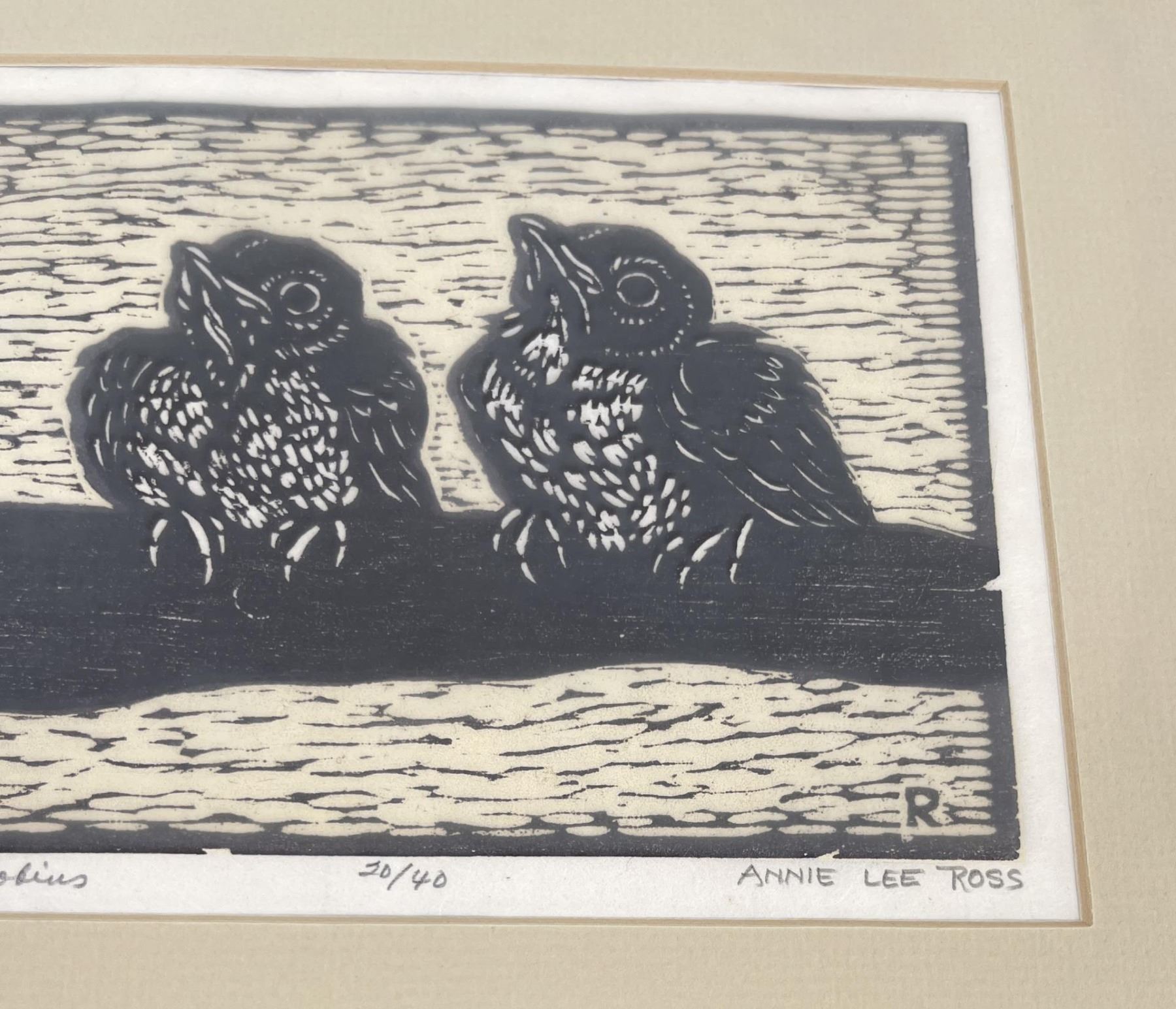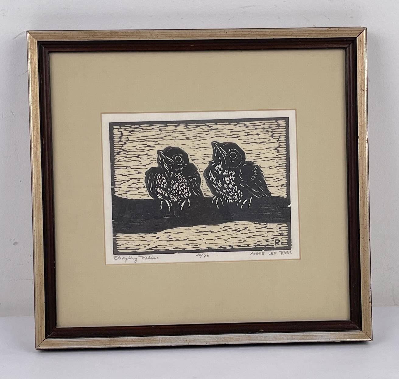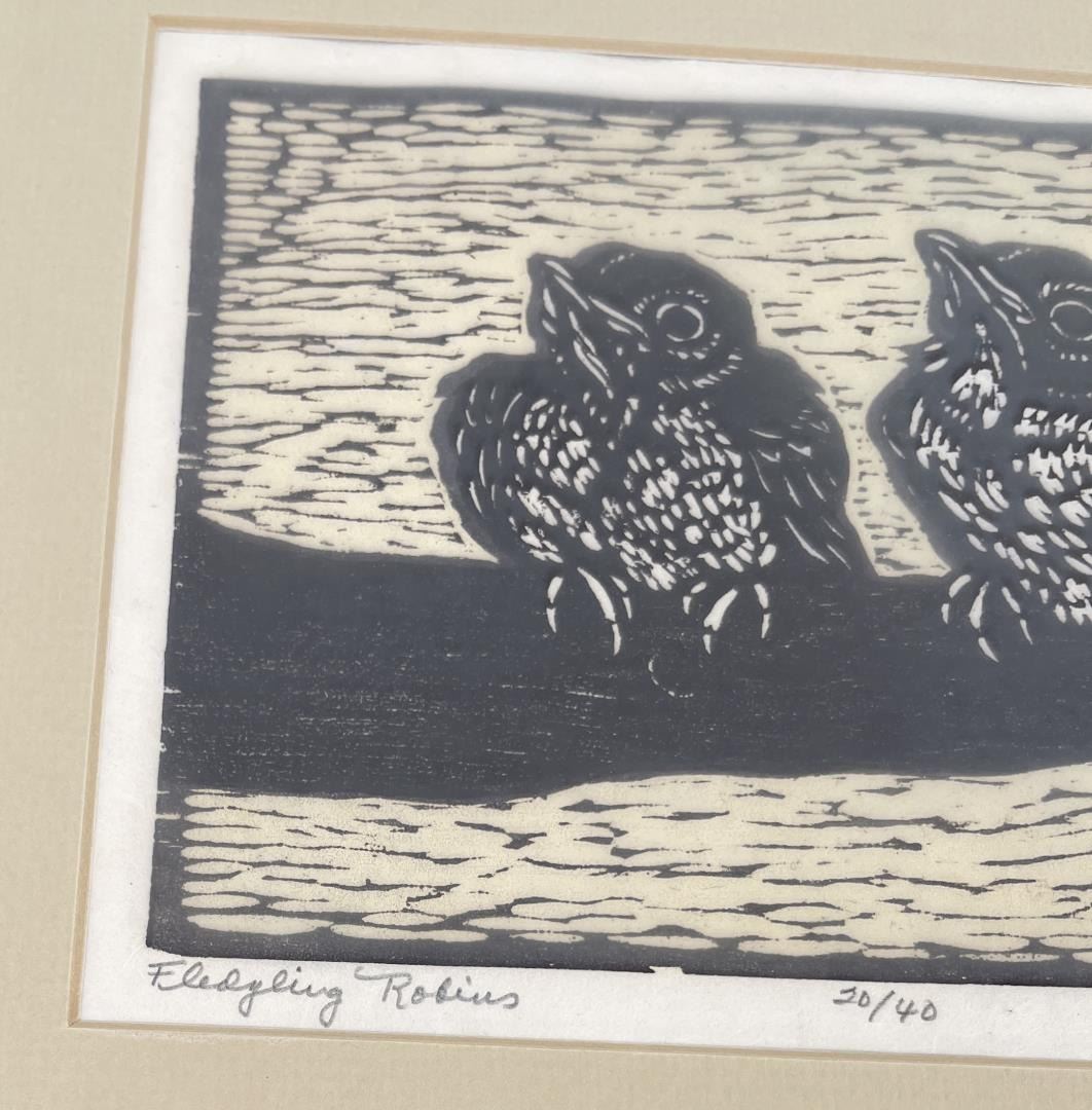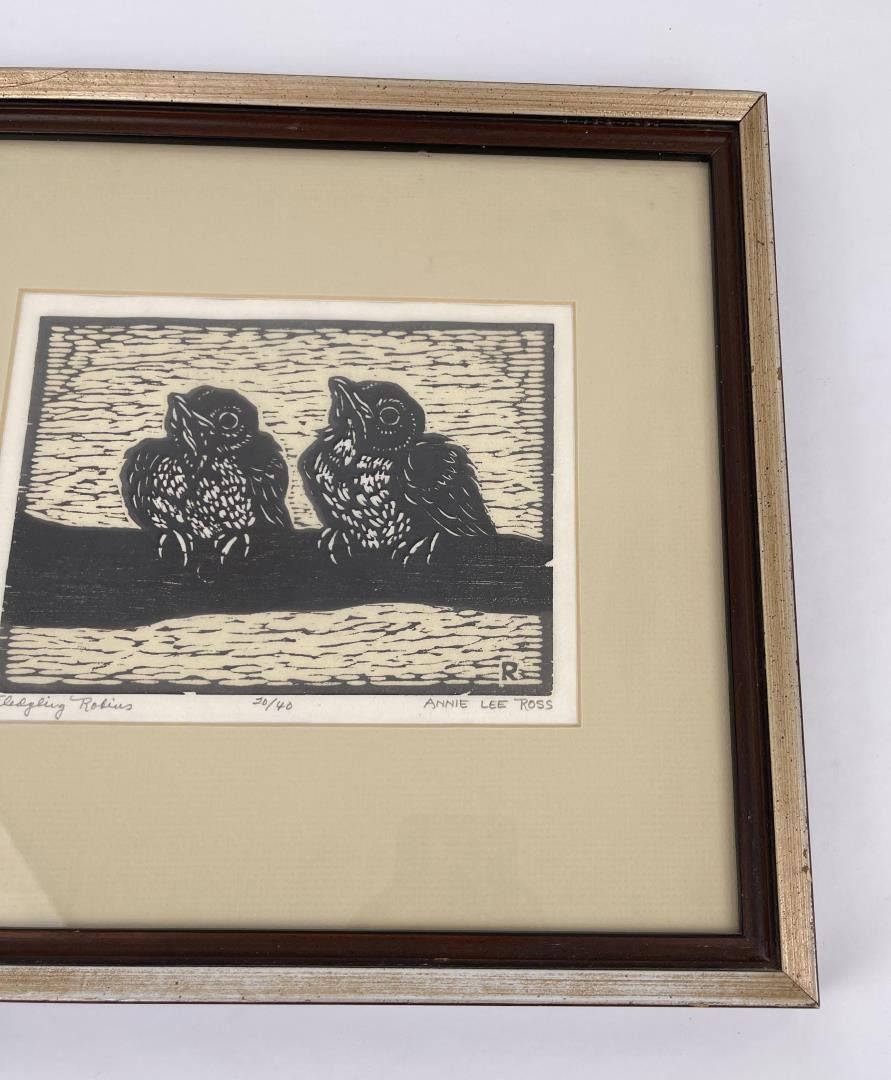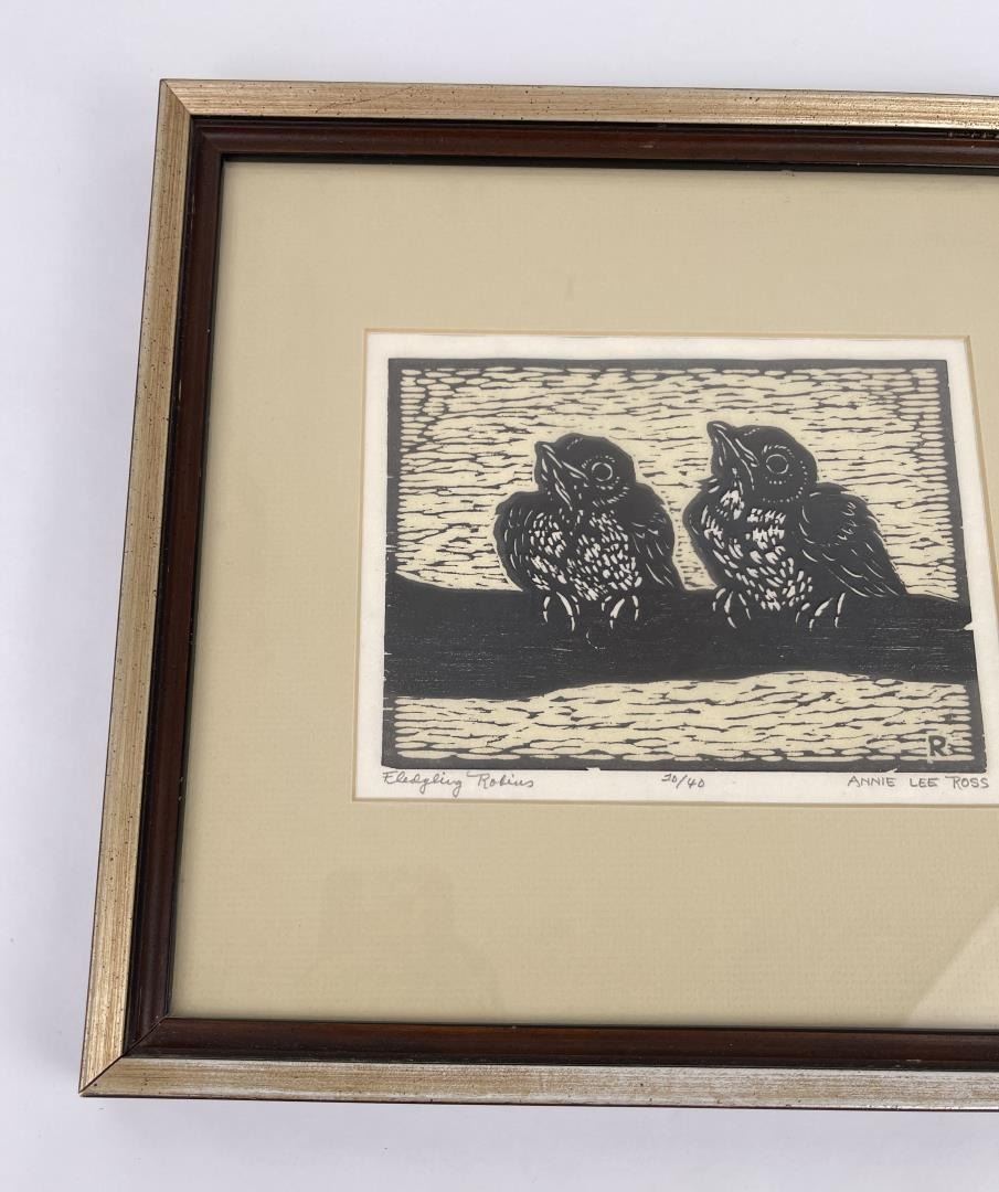 Signed and numbered. Title is Fledgling Robins. 13" by 14" framed.