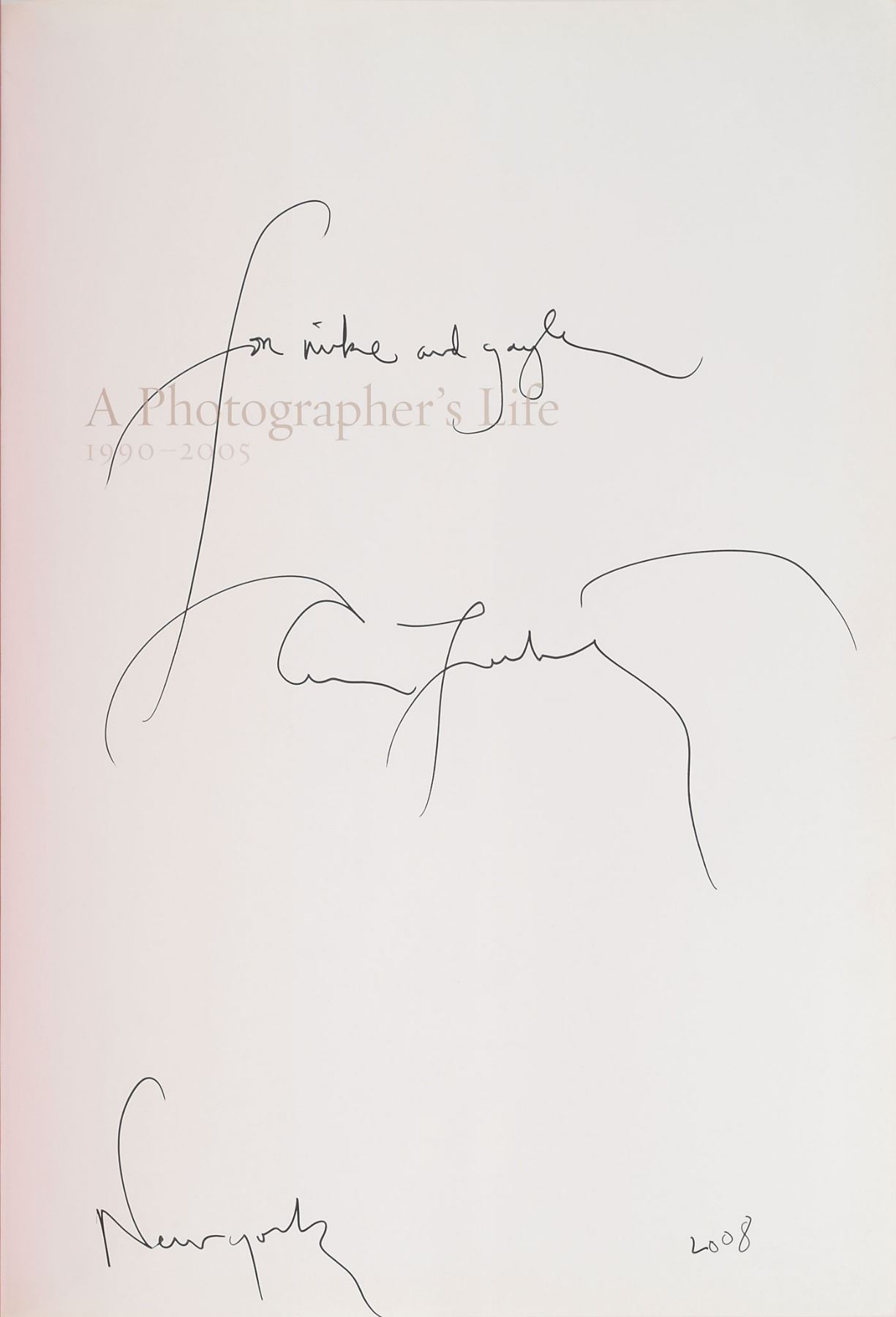 Signed book: A Photographer's Life: 1990-2005. NY: Random House, 2006. Hardcover with dust jacket, 10.5 x 13.75, 472 pages. Signed and inscribed on the half-title page in black ink, "For Mike and Gayle, Annie Leibovitz, New York, 2008." In fine condition.