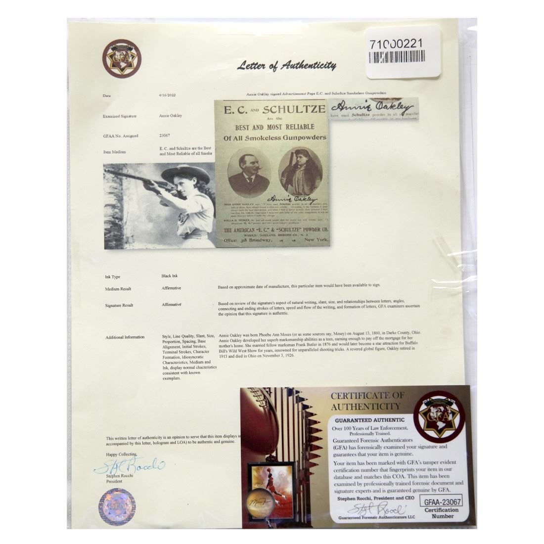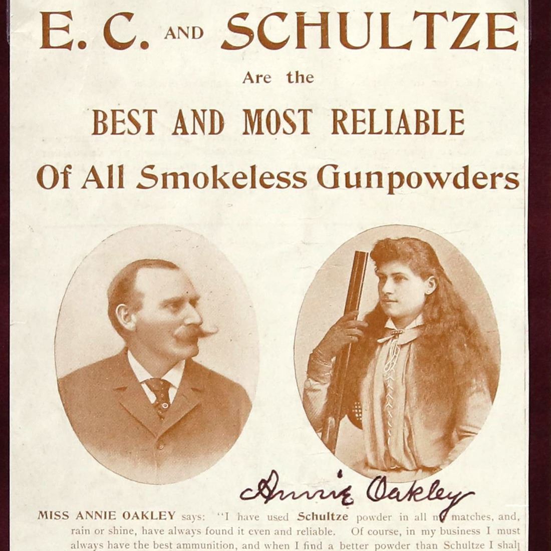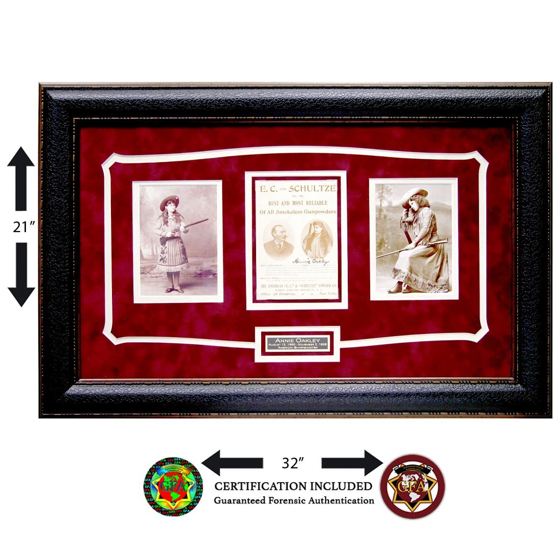 Annie Oakley (August 13, 1860 – November 26, 1926). Signed 3 x 8 Ad Page for Smokeless Gunpowder. Black ink signature signed below photograph of Annie Oakley. in her early teens, Annie Oakley started hunting game for a grocery store. She earned so much from her skills that by the time she was 15, Her dad was able to pay off the mortgage on her mother's home. Oakley met Native American leader Sitting Bull in 1884, and he was so impressed with her manner and abilities that he "adopted" her and bestowed upon her the additional name "Little Sure Shot." Oakley and Butler then joined Buffalo Bill's Wild West Show in 1885. The couple toured with the show for more than a decade and a half, with Oakley receiving the spotlight and top billing while Butler worked as her manager, assisting Oakley with her stunning displays of marksmanship. Audiences were wowed. She could shoot off the end of a cigarette held in her husband's lips, hit the thin edge of a playing card from 30 paces and shoot distant targets while looking into a mirror. She would also shoot holes through cards thrown into the air before they landed, inspiring the practice of punching holes in a free event ticket being referred to as an "Annie Oakley." This item has been professionally custom matted and framed. Comes with a Letter of Authentication from Guaranteed Forensic Authenticators, along with the GFA guarantee of authenticity.