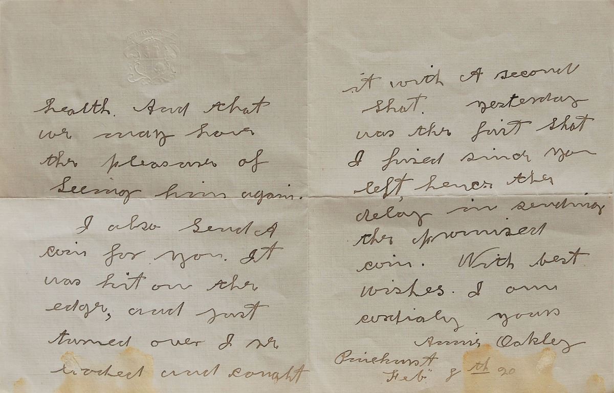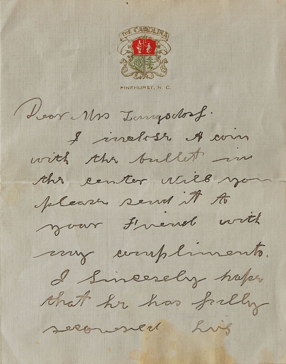 Remarkable ALS, three pages on two adjoining sheets, 5 x 6.5, The Carolina, Pinehurst, NC letterhead, February 8, 1920. Letter to Mrs. Jacob L. Langsdorf, in full: “I inclose a coin with the bullet in the center will you please send it to your friend with my compliments. I sincerely hope that he has fully recovered his health. And that we may have the pleasure of seeing him again. I also send a coin for you. It was hit on the edge, and just turned over I re loaded and caught it with a second shot. Yesterday was the first shot I fired since you left, hence the delay in sending the promised coin.” Includes the second coin mentioned, a wheat penny which is considerably bent and exhibits a large dent from the bullet hitting it on the face, as well as a nick on the edge; a small loop has been soldered to the edge of the coin. Also includes the original mailing envelope addressed in Oakley’s hand, incorporating a full signature, “Annie Oakley,” in the return address area. In fine condition, with light stains to the bottom edges of the letter. Accompanied by a period handwritten identification tag suspended from a thin ribbon.