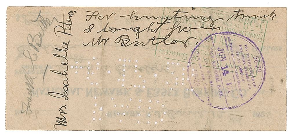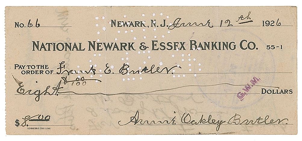 National Newark & Essex Banking Co. check, 6.25 x 2.75, filled out and signed by Oakley, "Annie Oakley Butler," payable to her husband Frank E. Butler for $8, June 12, 1926. The reverse is endorsed in pencil by Frank Butler, and bears a note in Oakley's hand which reads, "For hunting trunk I bought from Mr. Butler." In fine condition, with two light vertical folds. After winning a shooting contest against traveling marksman and future husband Frank Butler, the five-foot-tall, 15-year-old Oakley quickly earned a reputation as one of the finest and fastest triggers in the Midwest. She eventually set out with Butler on a national tour with Buffalo Bill's Wild West, earning more than any other performer with the exception of the show's eponymously named star. A superb autograph from the famed female sharpshooter.