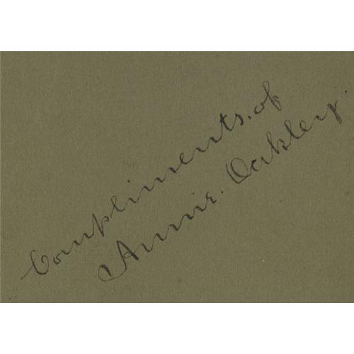 <B>Annie Oakley Cabinet Photograph Signed.</B></I> Silvertone portrait bust photograph, 5.5" x 6.5", np, nd. A middle aged Annie Oakley photograph taken after her wild west show days, neatly and boldly signed on the back "<I>Compliments of Annie Oakley</B></I>". Annie came to fame by way of a bet. Her future husband Frank Butler bet an owner of the hotel $100 that he could beat anyone in a shooting contest. He was matched with Annie and lost his bet but shortly after won her heart. They had their own act for a while and Annie would regularly shoot ashes off Frank's cigarette. They joined Buffalo Bill's Wild West show in 1885. Standing only five feet tall Oakley befriended Sitting Bull who referred to her as "Little Sure Shot". It was at his request that she knocked the ashes off a cigarette of the Crown Prince of Germany, the future Kaiser Wilhelm II. Oakley later joked that had her aim been a little worse, she might have prevented World War I. Ironically, her greatest source of wealth came in later years when William Randolph Hurst's newspaper created a false story that she was using cocaine. She sued Hearst and won on 55 of 56 counts, netting her a sum that allowed her to be a philanthropist giving generously to women's causes and orphans. It is reported that the portrait brooch she wears is believed to be the images of two of the orphans she supported. A diligent search of auction records indicates less than 12 of these at market in the last 30 years. The present example being among the finest condition. Very Fine.