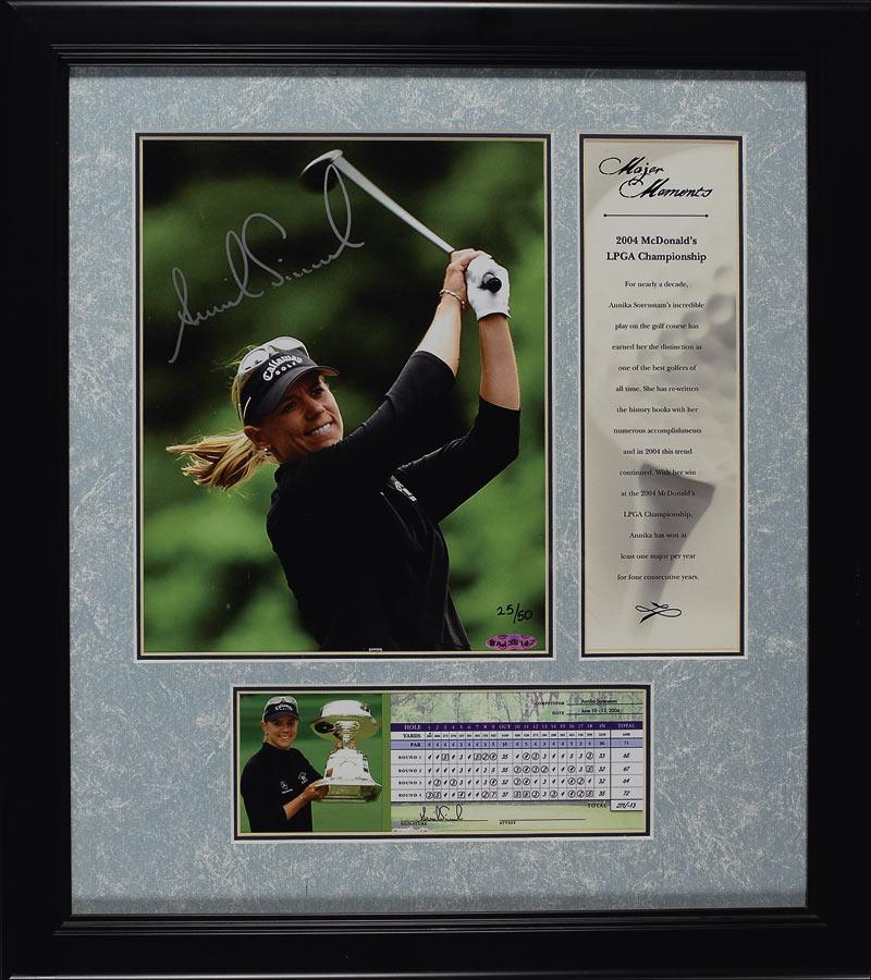 Limited edition color glossy 8 x 10 photo of Sorenstam teeing off at the 2004 McDonald’s LPGA Championship, signed in silver felt tip. Double matted and framed with a replica scorecard and printed description of the tournament to an overall size of 17 x 19. In fine condition, with limited edition notation #25/50 and Upper Deck label at the bottom right corner. Accompanied by a certificate of authenticity from Upper Deck. Pre-certified Steve Grad/PSA/DNA and RRAuction COA.