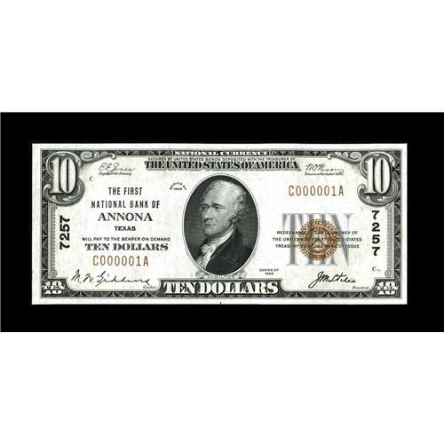 <B>Annona, TX</B></I> - $10 1929 Ty. 1 <B>The First NB</B></I> Ch. # 7257<BR>Two sheets and one single note formerly made up the total small size population from this scarce one bank Red River County location. Fortunately for collectors, both of the number one sheets have now been cut, making the town available to those who could not afford or did not desire an all serial number 1 sheet to cover the community. Most all of the number ones have now disappeared into long term holdings, and appearances are now most infrequent. This piece is a simply lovely number 1 specimen fit for the finest of collections and is certain to delight its new owner. <B>Gem Crisp Uncirculated.</B></I><BR><BR><b>Shipping:</b> Coin/Currency (<a target="_blank" href="http://www.heritageauctions.com/common/shipping.php">view shipping information</a>)