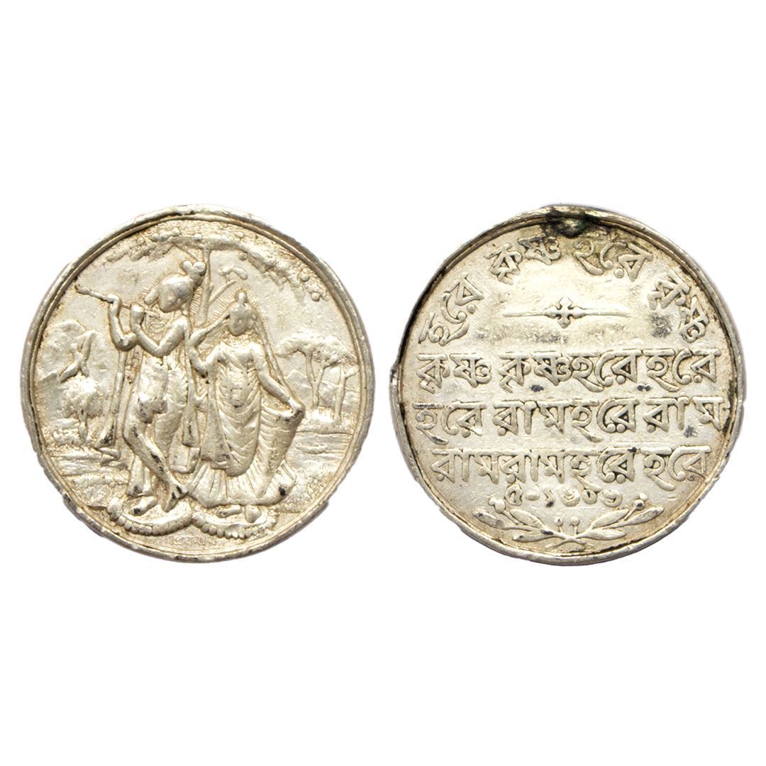 Annonymous Silver Medal, 5.58 gm, obverse. Radha krishna, reverse. Bengali script ‘Hare krishna Hare krishna krishna krishna hare hare’, very fine, scarce.