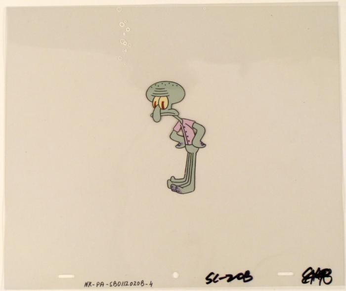 This original animation cel is from the Nickelodeon TV show SpongeBob Squarepants. The story takes place under the deep blue sea in Bikini Bottom, where SpongeBob resides. SpongeBob, who is a yellow, porous sponge, is your typical happy-go-lucky character, as he is always cheerful and enjoys making people laugh. Patrick Star, SpongeBob's neighbor who is a starfish, is your average children's show idiot, as he boasts knowing nothing and is often getting himself into ridiculous situations. Between the homes of these two lies the home of the miserable Squidward, a squid, who is known for being grouchy and playing tricks on SpongeBob and Patrick. Both SpongeBob and Squidward work at the Krusty Krab, a fast food business run by the greedy money-loving Mr. Krabs, a crab, the arch rival of the evil, possibly misunderstood, Plankton. Another neighbor, Sandy Cheeks, an athletic squirrel who normally wears an astronaut's space suit, was introduced in "Tea at the Treedome." She spends most of her time inventing and experimenting. Squidward seems to be annoyed by someone.Original Production Animated Cel Overall Size of Cel: 10 1/2" x 12 1/2" Excellent ConditionThis is an original hand-painted cel set-up used in the production of an episode of "SpongeBob SquarePants." Each one-of-a-kind set-up represents a slight change in position of the characters. When individually photographed and projected in rapid succession, the images appear to move.