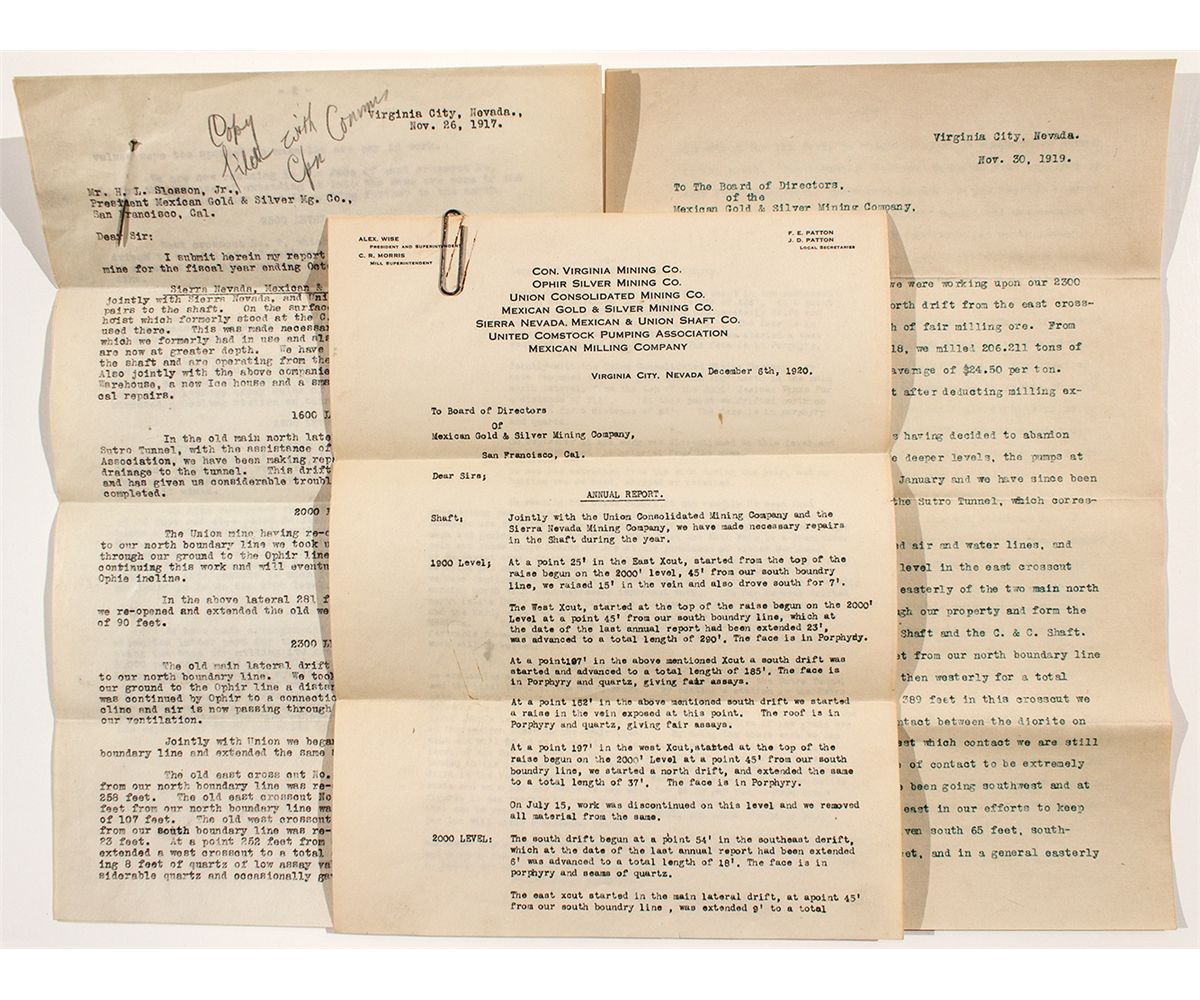 c1917 Lot of 3: Annual mining reports to the Board of Directors in San Francisco, of the Mexican Gold & Silver Mining Co. from 1917 to 1920. These reports detail production & conditions from the various mine levels, such "1600 Level, 2300 Level, 2900 Level," and so forth. There are paragraphs indicating Mill production, shaft and water issues, and many others. One letter is written by Alex Wise, a star superintendant of the time, reporting in his annual letter the conditions and production of the Mexican Mines. These letters are all type-written, and in excellent condition. These are fascinating reading, and a true piece of Comstock mining history. - HKA#65225