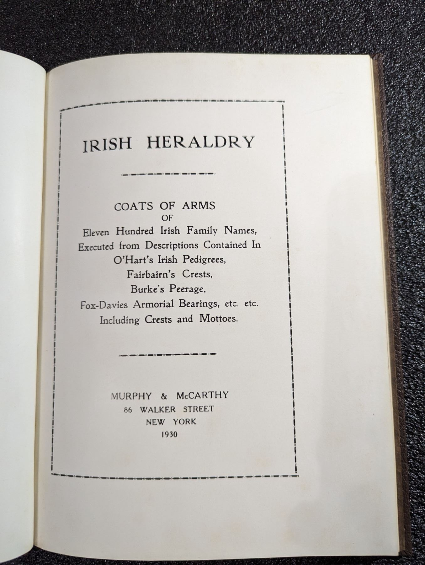 Anon. IRISH HERALDRY. COATS OF ARMS OF LEADING IRISH FAMILIES. Murphy & McCarthy, New York. 1930. 4to. 19 pages. Original brown embossed leatherette, gilt. 40 plates of color drawings. Fine. Coats of arms of eleven hundred Irish family names, executed from descriptions contained in O'Hart's Irish pedigrees, Fairbairn's crests, Burke's peerage, Fox-Davies armoral bearings, etc. etc. Includes crests and mottoes. Lot weight: 0 lbs 14oz. Subject(s): Irish Heraldry.