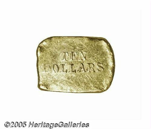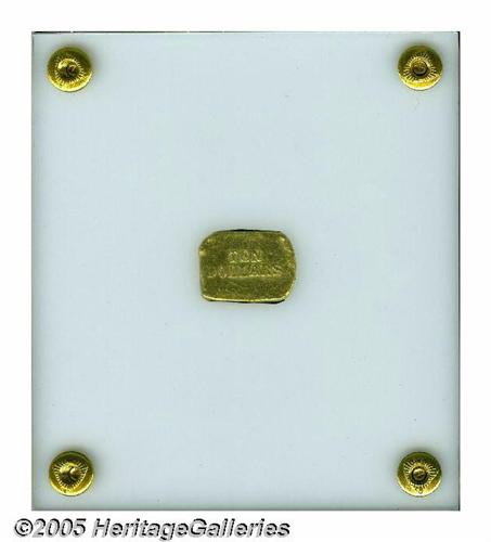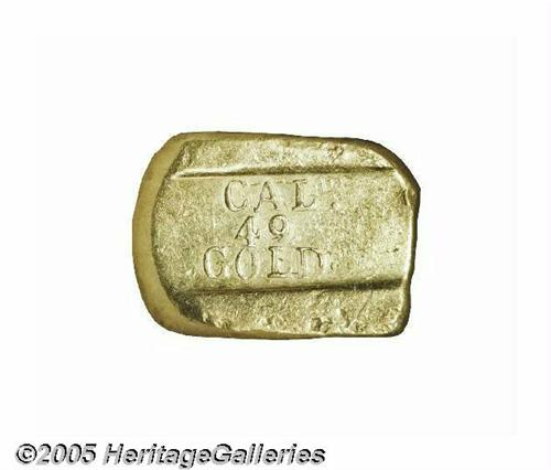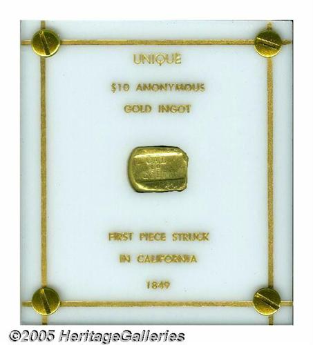 <B>Anonymous Assayer "1849" Ten Dollar Gold Ingot AU55 Uncertified.</B></I> 22.9 x 16.8 x 3.6 mm. Inscribed CAL. / 49 / GOLD on the face in three lines and TEN / DOLLARS on the back in two lines. This unique ingot is listed and illustrated by Don Kagin on page 312 of his 1981 reference <I>Private Gold Coins and Patterns of the United States.</B></I> His description states:<BR> Specie Ingot.<BR> Obv. CAL/49/GOLD<BR> Rev. TEN/DOLLARS<BR> Kagin further noted: "Little is known concerning this ingot. It may have antedated both Moffat & Co. and Norris, Gregg & Norris. One can also speculate that only a well-known firm, perhaps Moffat & Co., could issue an 'unnamed' ingot and expect it to circulate without question."<BR> Perhaps it can be punch linked to one of the known issuers of gold ingots, which would identify the maker and help to unravel its mystery. The bright greenish-gold color of this ingot is typical of native California gold with its high silver content. The actual lettering on each side has the appearance of being punched from logotypes, rather than individual letter punches. On the front, GOLD is clearly doubled and possibly tripled. The individual letters on each side are formed differently, for example, the A and L on the front, and those letters on the back, clearly have different shapes which would most likely eliminate the use of individual punches. Listed in the <I>Guide Book</B></I> in the late 1950s, and also in the 1995 edition of Coin World's <I>Comprehensive Catalog and Encyclopedia of United States Coins.</B></I><BR><I>From The Great Western Collection of Territorial Gold.</B></I>