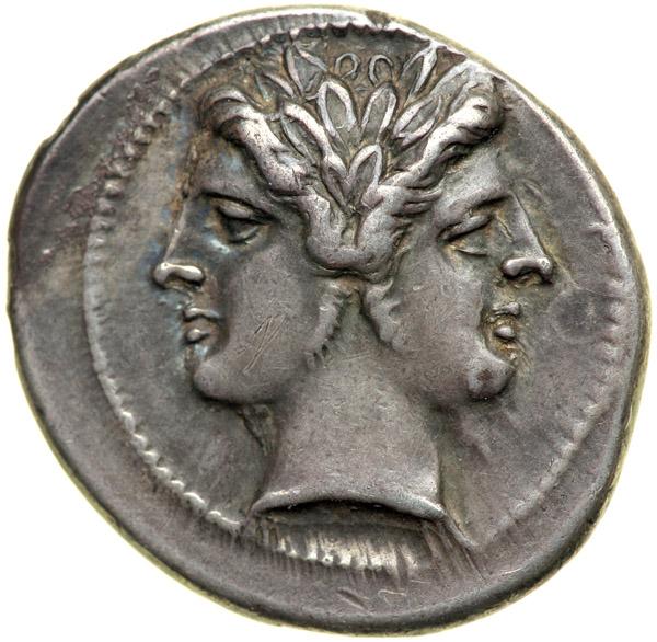Minted before the silver denarius became the main denomination of the Roman Republic, the quadrigatus is easily recognized by the victorious quadriga ridden on the reverse. On some varieties, like this one, the quadriga is actually being driven by Victory with Jupiter standing before, holding thunderbolt and goad. A double-head of the Dioscuri or Janus head of varying style graces the obverse. These coins are thought to have been current just before and during the Second Punic War. The quadrigatus or didrachm is equivalent to six scruples. The weight suggests a continuation of the silver didrachm of Greek times in circulation within Magna Graecia .