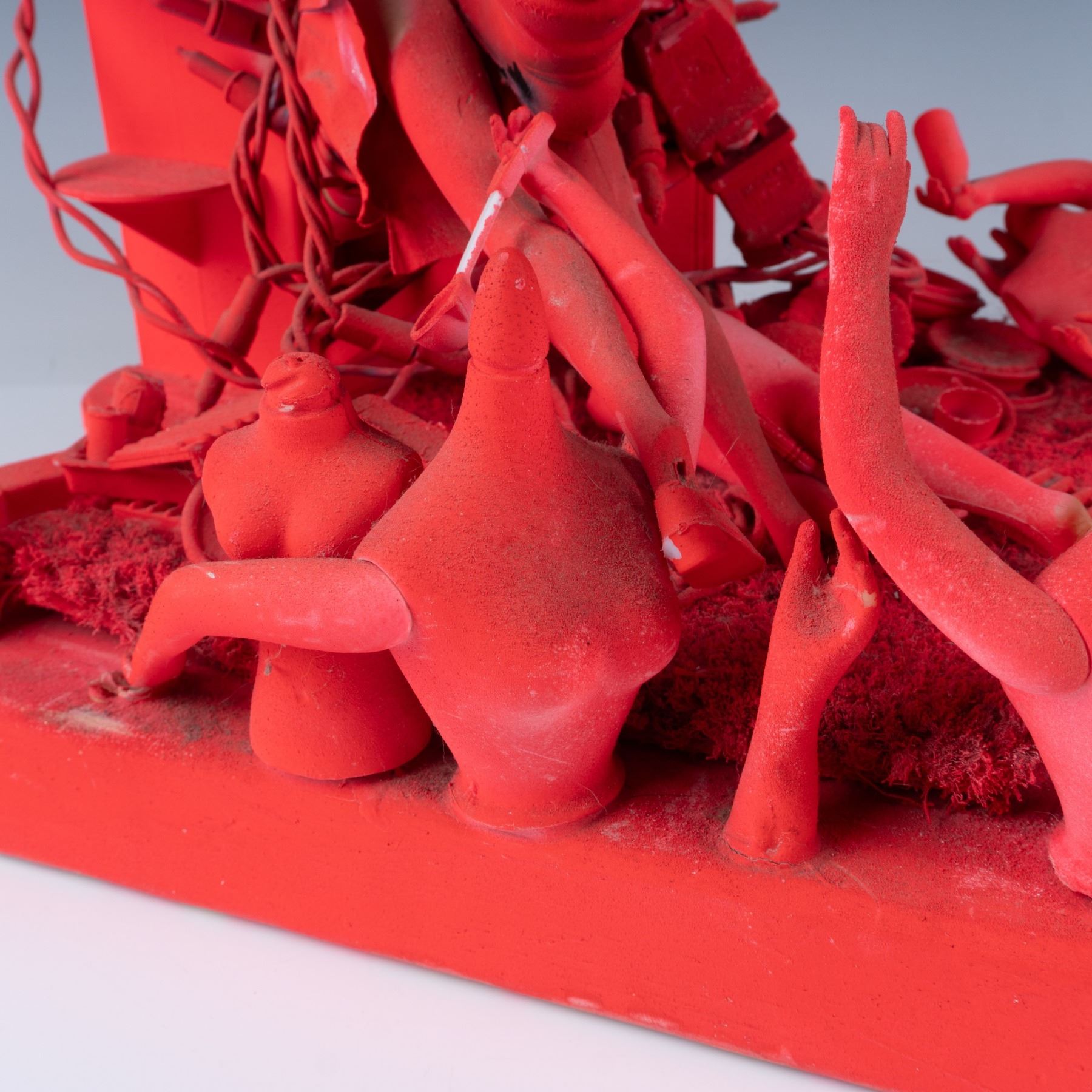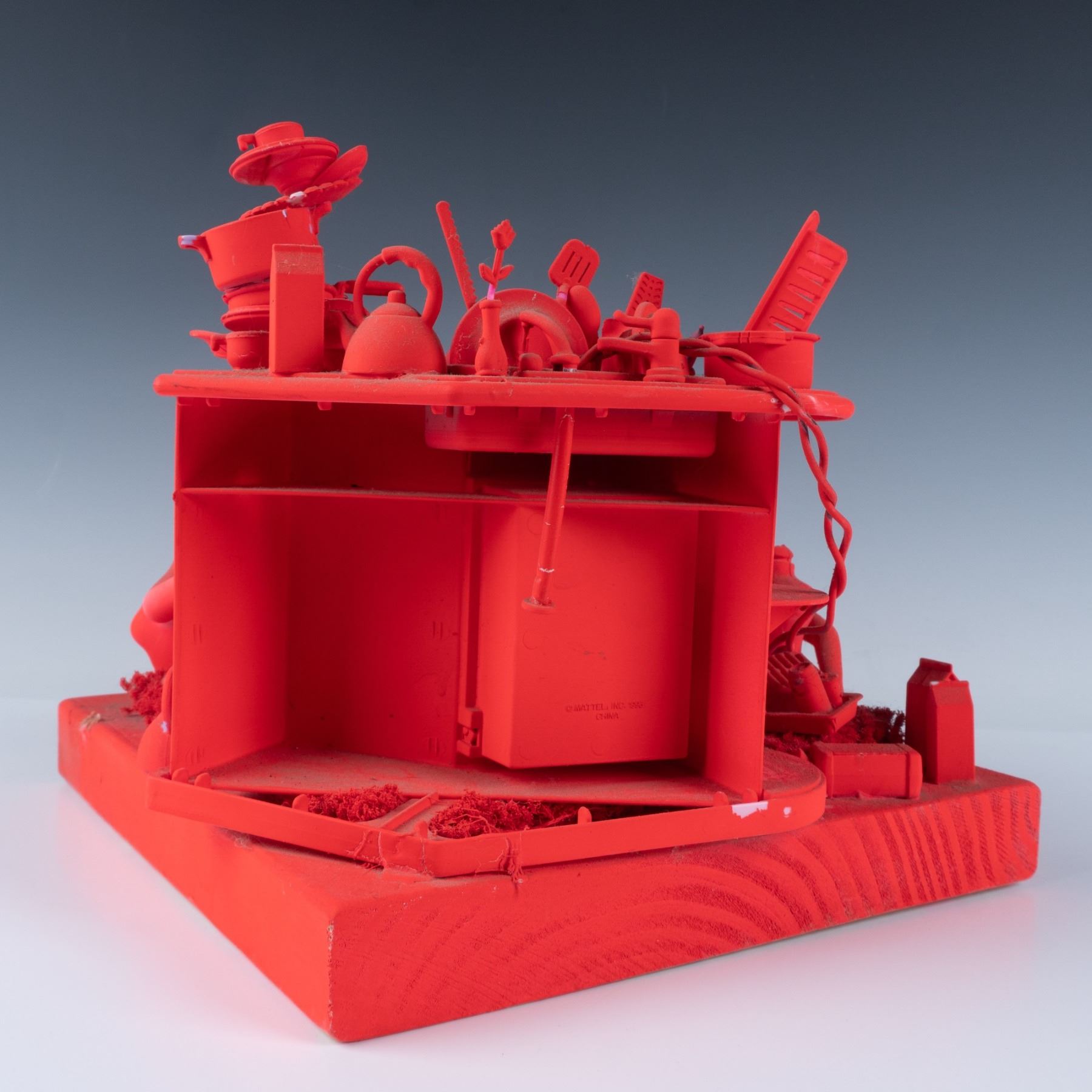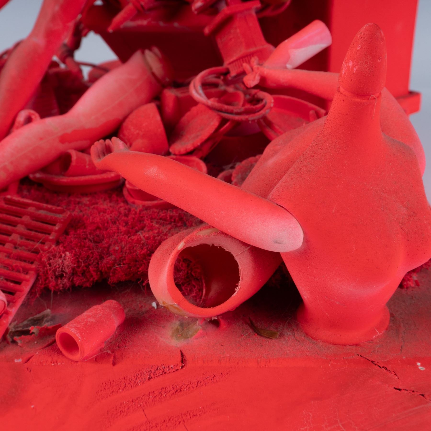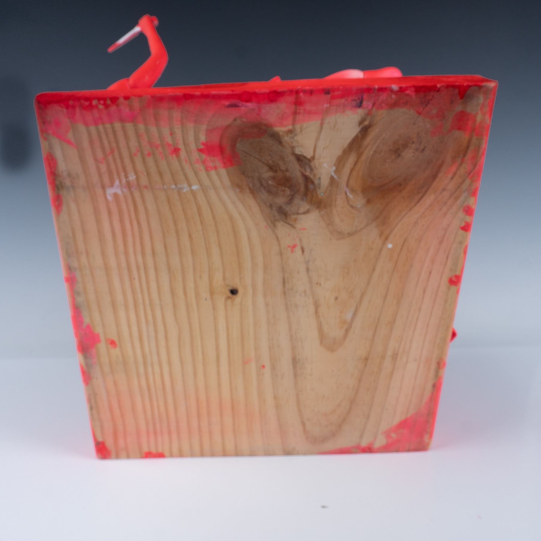 An eclectic assemblage of found objects, including doll body parts, a string of lights, and toy pots and pans, all glued to a square wooden base and finished with neon pink spray paint. The piece fuses elements of childhood play with vibrant color and unexpected juxtaposition, creating a surreal, playful yet unsettling composition.