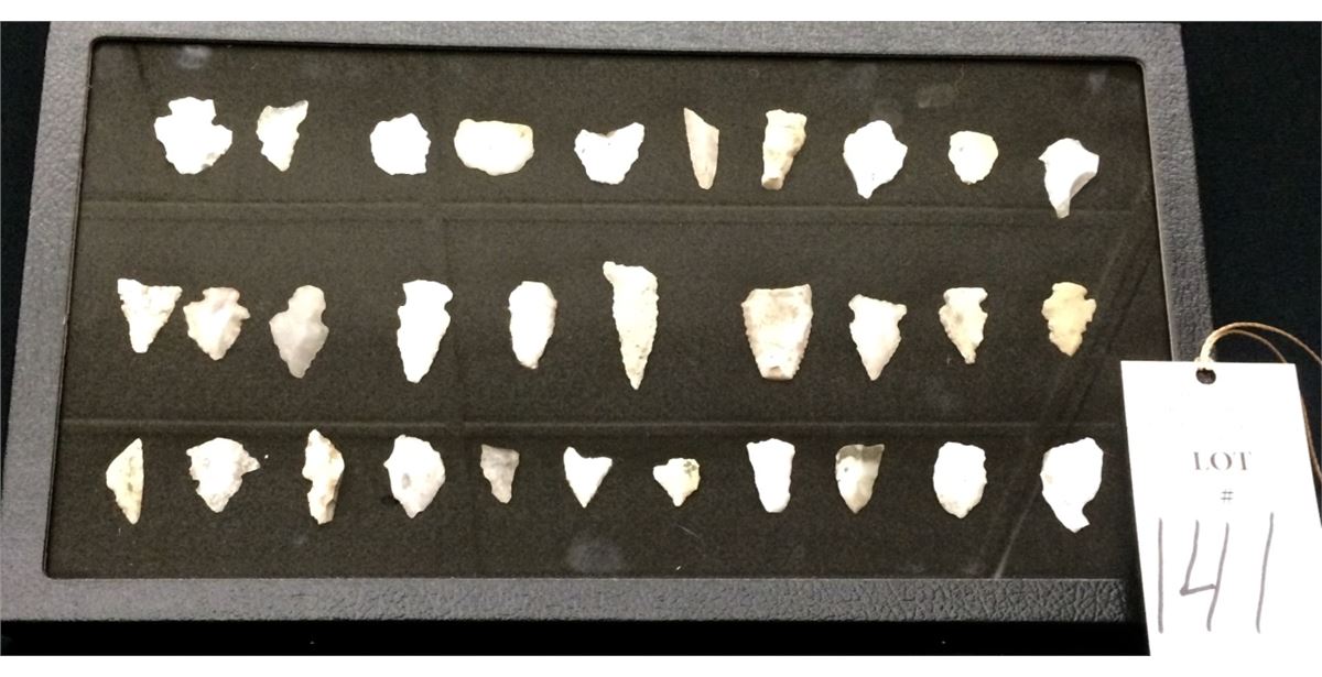 This arrowheads display (31 pieces) came right out of the old Frontier Relics Museum (Orville Mickens estate). Mr. Mickens found most of the items in his museum while tromping around historical areas from the Old West in Arizona and New Mexico. Box measures 8” x 14.5” x 1” deep. Shipping: There will be a $7 handling / packaging fee for shipping this lot. The actual cost of postage will be added on top of that.