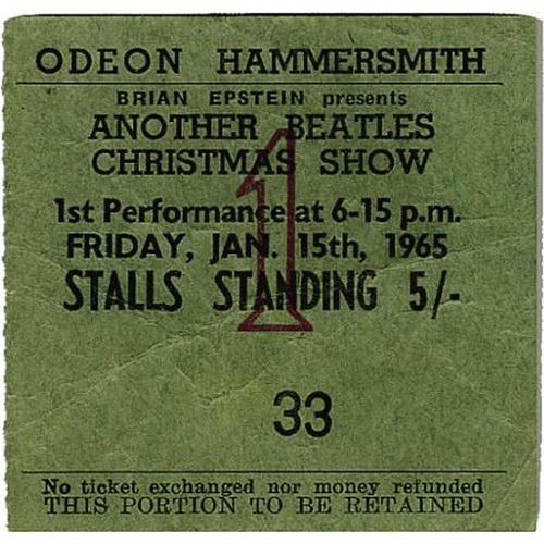 <B>"Another Beatles Christmas Show" Ticket Stub.</B></I> From the January 11, 1965, performance of the Holiday concert series at the Odeon Hammersmith. In Excellent condition, with minimal wear.<BR><BR><b>Shipping:</b> Flat Material, Small (<a target="_blank" href="http://www.heritageauctions.com/common/shipping.php">view shipping information</a>)