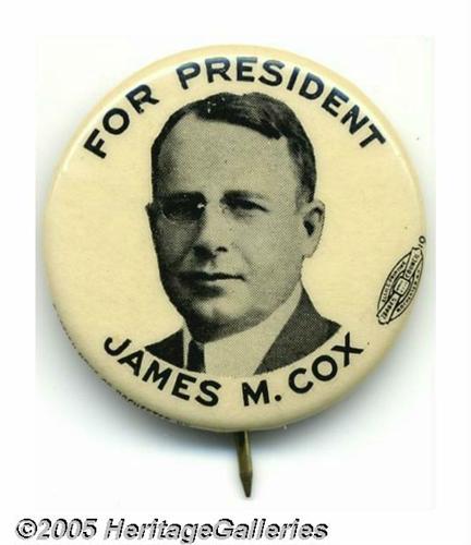 <B>Another Extremely Rare 1 1/4" Cox Button</B></I> Like its sister lot with dark gray background, this is the plate specimen from the original 1896-1972 Hake book (page 108). The name of the respected manufacturer, Bastian Bros., appears discreetly on the curl. Once again we cannot recall seeing another example; possibly this is a pair of manufacturer's samples which never went into general production. Beautiful condition. Lot:262