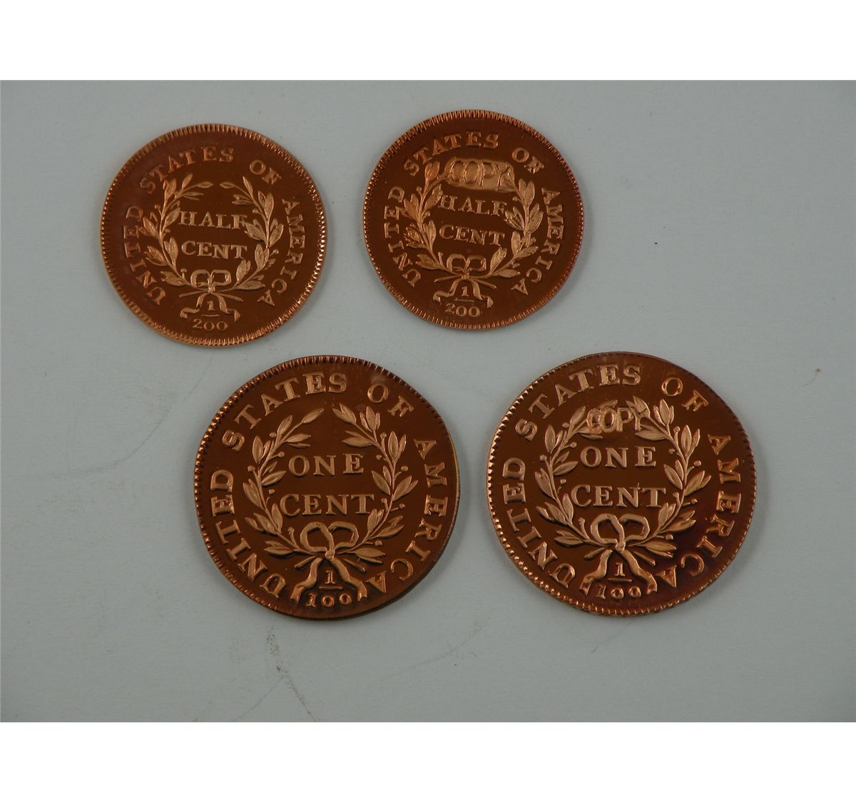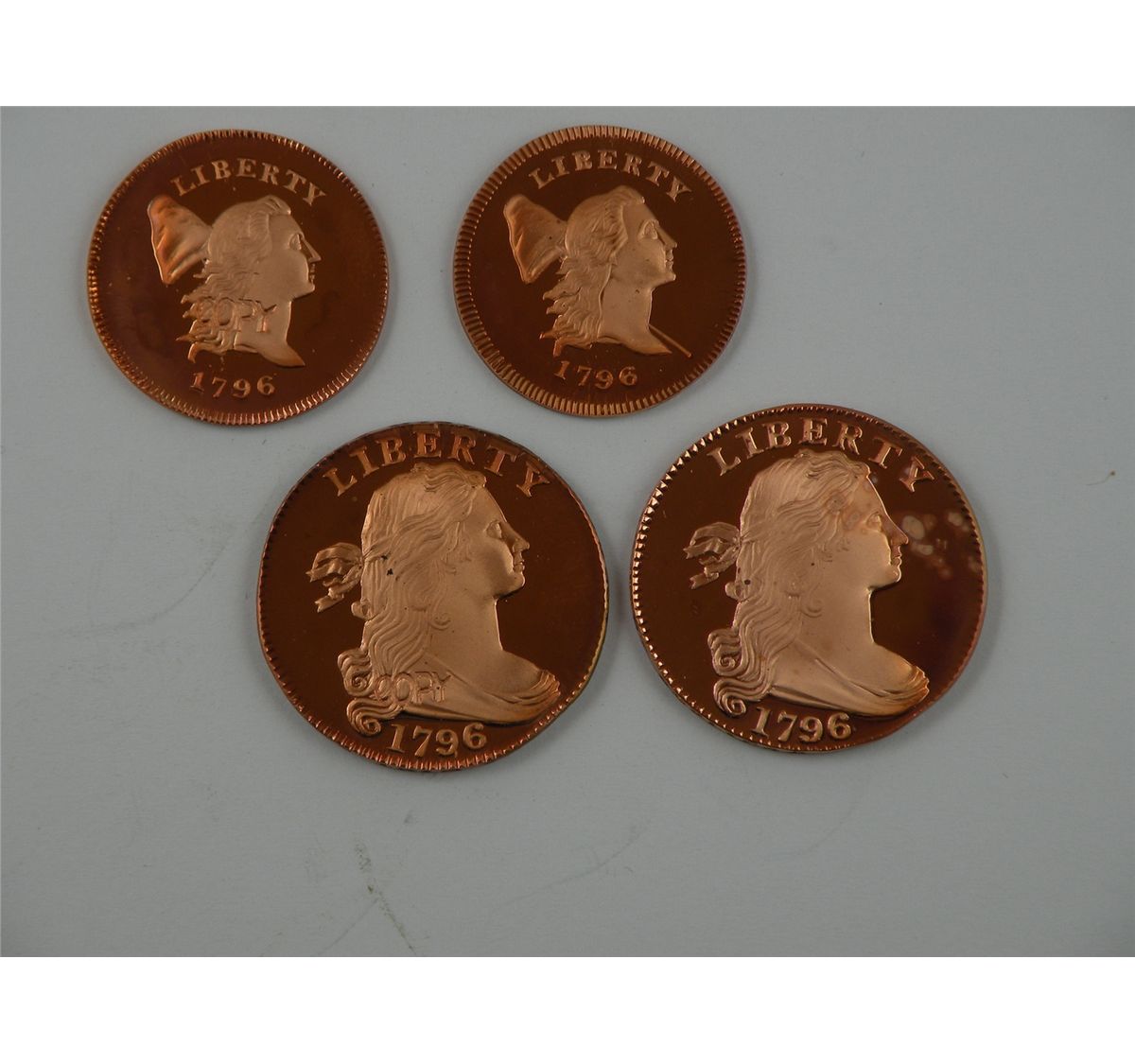 Another Gallery Mint early copper replica foursome: 1/2C 1796 w/Pole, 1796 No Pole; 1C 1796 Draped Bust (2). All are Gem Br.Proof, full red and are marked "COPY". A total of 4 coins. Est.$100